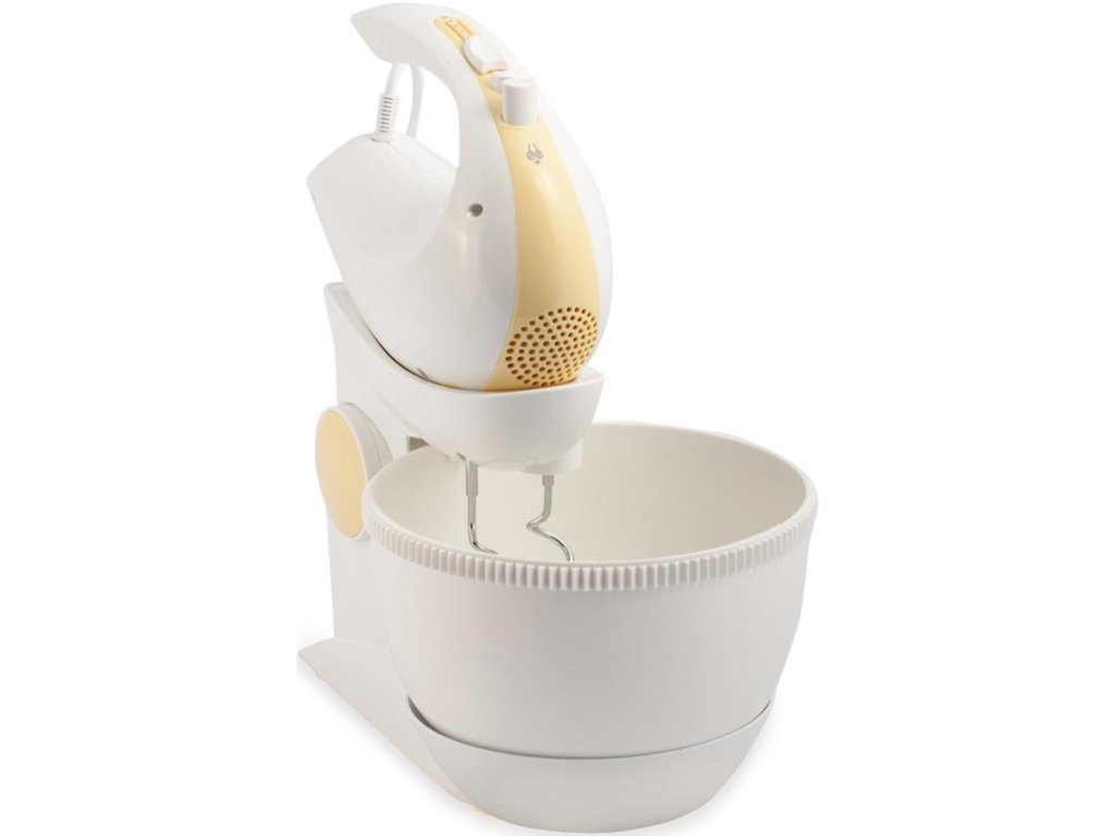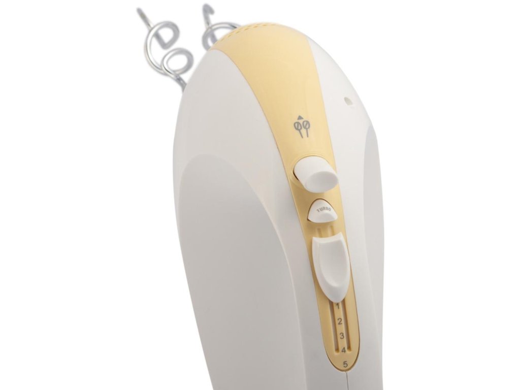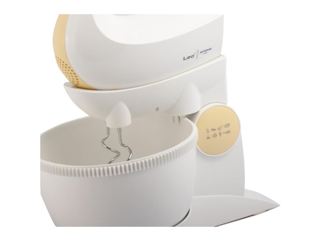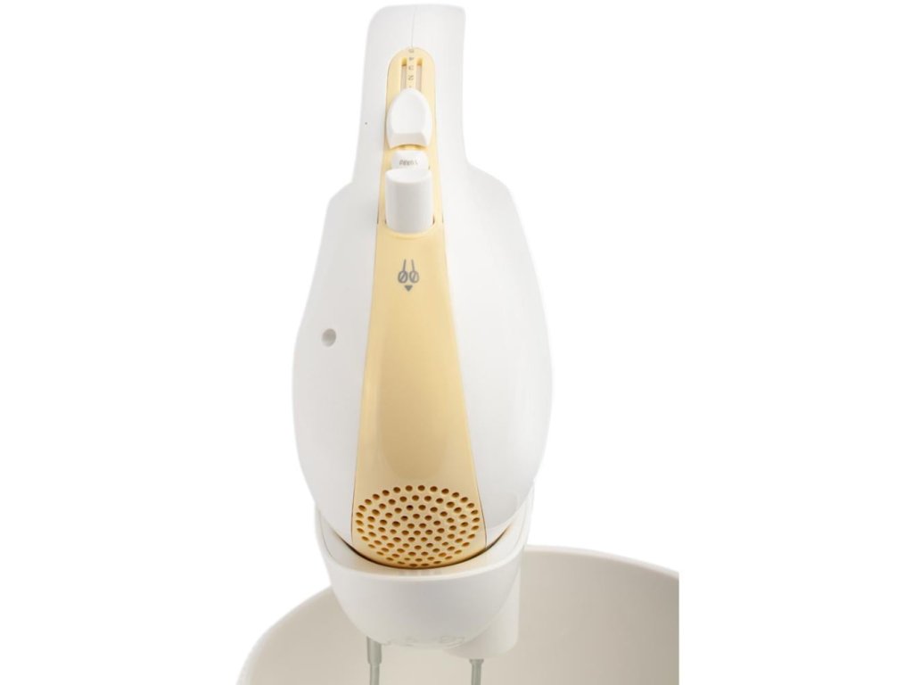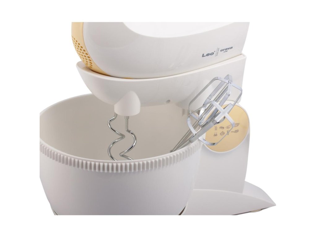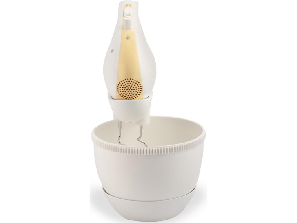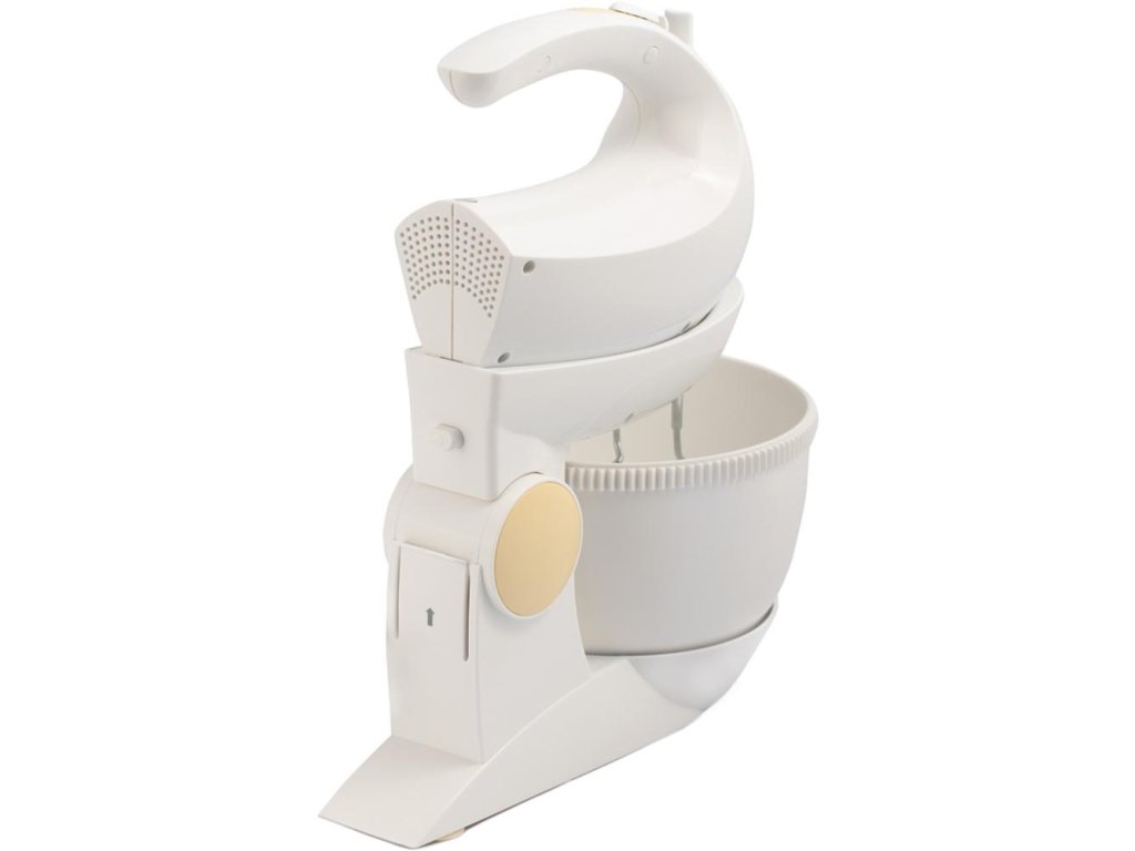 ruční šlehač s mísou • příkon 300 W • šlehá, míchá, mixuje • 5 rychlostí • turbo režim • 2,5l otočná nádoba s mechanickým pohonem • háky na míchání • šlehací metly