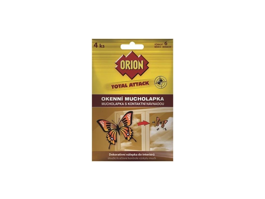 ORION TOTAL ATTACK okenní mucholapka je dekorativní nálepka na okna napuštěná návnadou na mouchy určená k nalepení na vnitřní stranu okenních skel. Mouchy se dostanou do kontaktu s aktivní látkou a umírají. Mrtvé mouchy nezůstávají přilepené na povrchu. Jedná se o výrobek bez zápachu, jenž nevylučuje žádnou insekticidní látku. Je ideální k použití v kuchyních, dětských pokojích a jídelnách.