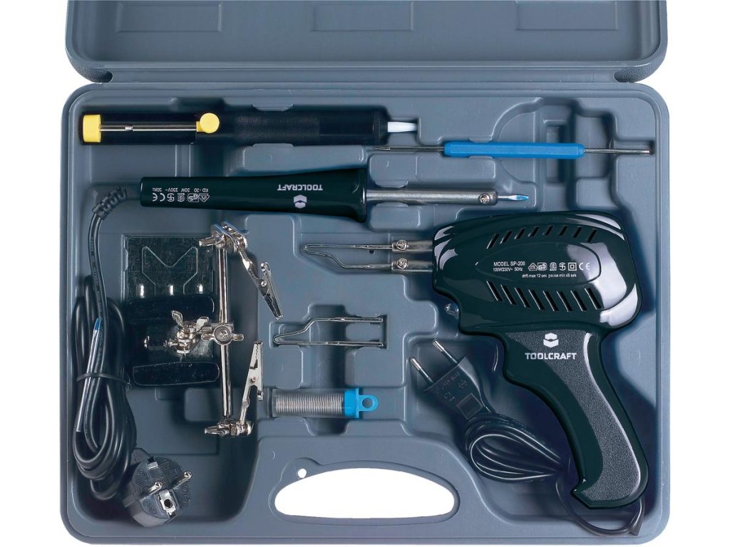 100W páječka vč. náhradního hrotu, 30W ruční páječka vč. odkládací plochy a poniklovaného hrotu, třetí ruka se stabilním stojanem a přesnými svorkami, odsávačka s výměnným hrotem (190 mm dlouhá, průměr 20 mm), čistící miska, pájecí drát o průměru 1,2 mm, S-Sn60Pb40 s ca 2% tekutiny