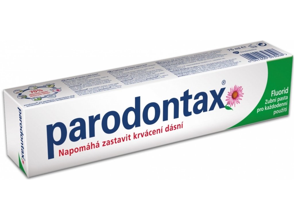 Obsahuje výtažky z bylin a jedlou sodu proti krvácení dásní a zubnímu kazu (1450 ppm fluoridů), bez pěnidla SLS. Parodontax Fluoride obsahuje 1450 ppm fluoridů a extrakty z bylin. Toto speciální složení bylo navrženo s cílem potlačit hlavní projev zánětu dásní – krvácení. Pomáhá udržovat zdravější dásně. Navíc obsahuje jedlou sodu – látku, kterou používají dentální hygienistky k čištění zubů pískováním.