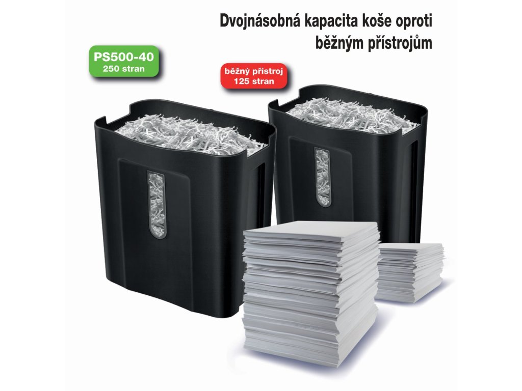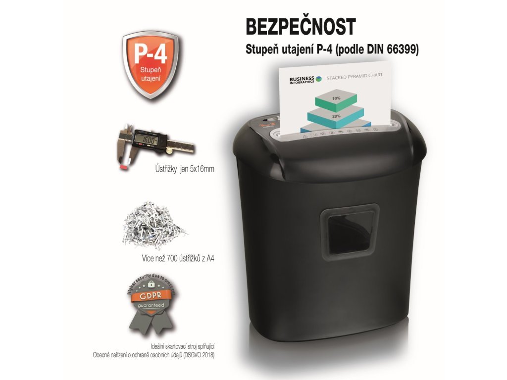 skartovač, bezpečnostní úroveň P-4, max. 10 současně skartovaných listů, rychlost skartace 2.5m/min, objem koše 21l, obdélníkový řez 5x16mm, skartace CD a kreditek, čidlo automatického spuštění, zpětný chod, 5.2kg
