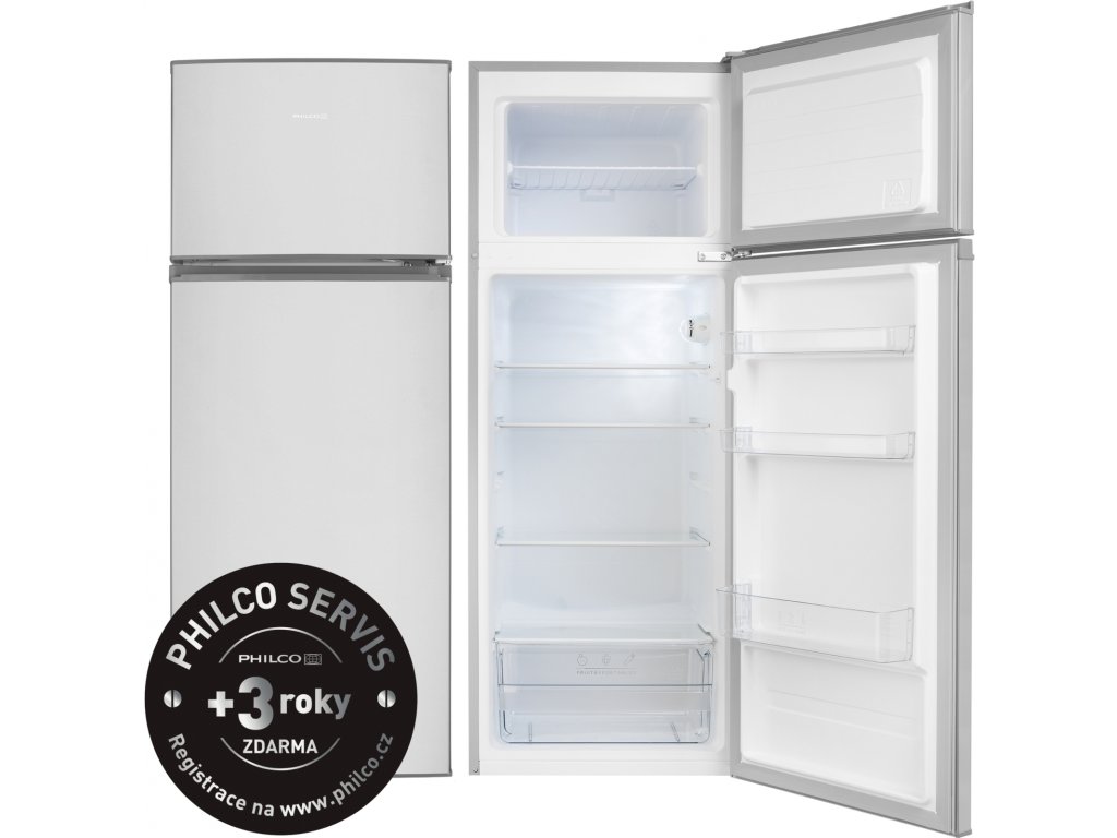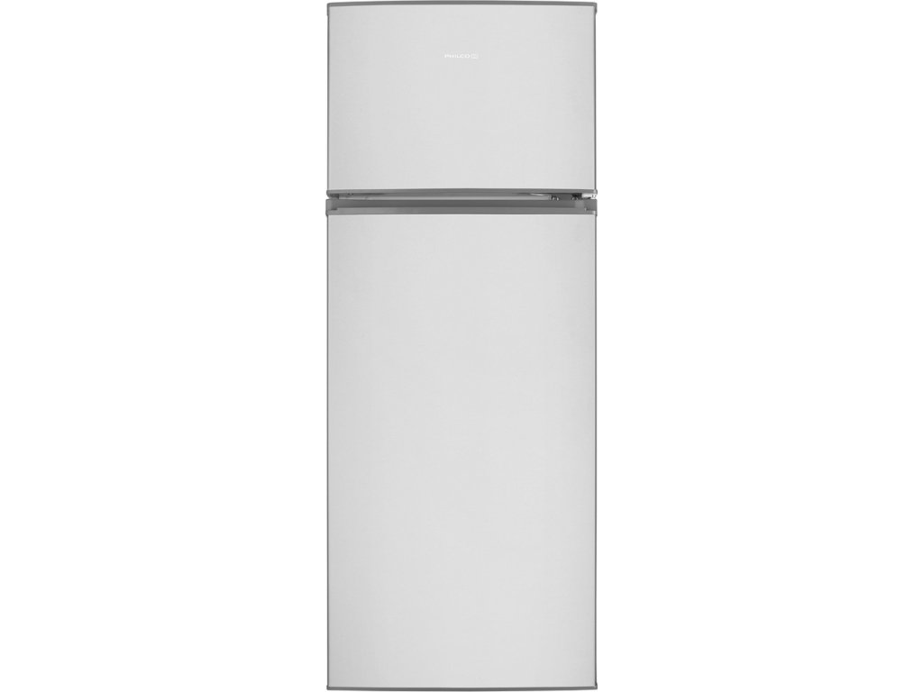 Dvoudveřová nerezová kombinovaná chladnička PHILCO PT204EX s mrazícím boxem v horní části, v energetické třídě E, s možností otočení směru otevírání dveří. Model je vybaven vnitřním LED osvětlením, dveřními poličkami, skleněnými poličkami v hlavní části ašuplíkem na ovoce a zeleninu.