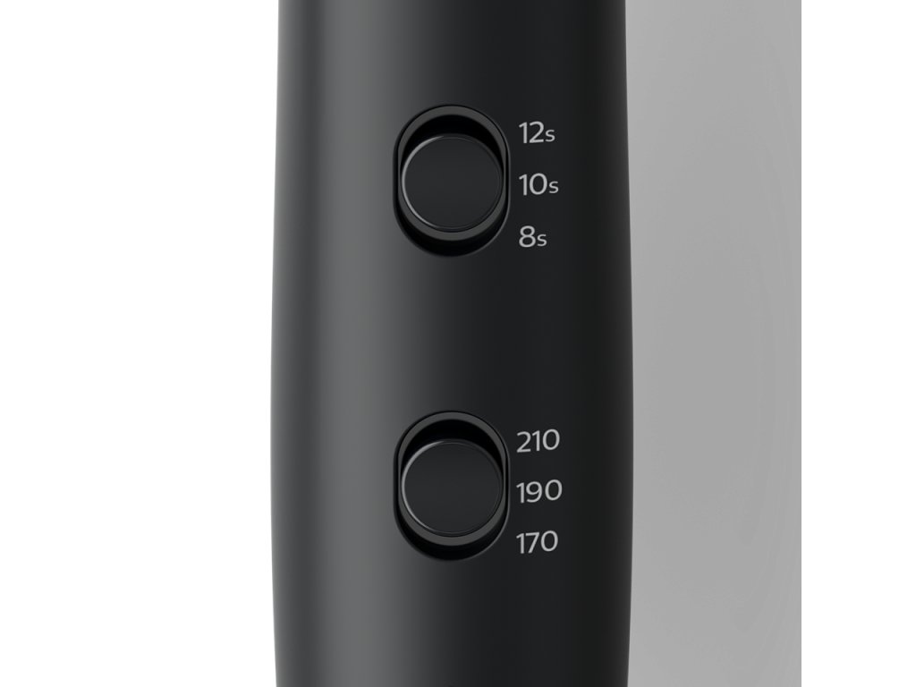 3 nastavení teploty (170, 190 a 210 °C), času (8, 10 a 12 sekund) a směru natáčení vlasů.