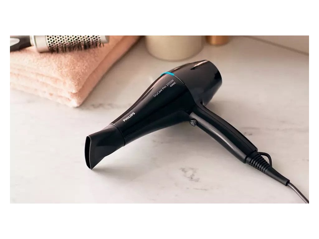 Vysoušeč vlasů Philips Pro je vybaven profesionálním motorem AC, který dosahuje rychlosti vzduchu až 130 km/h* pro rychlé a profesionální výsledky. K dispozici je také nastavení ThermoProtect pro optimální teplotu, která chrání před přehřátím.