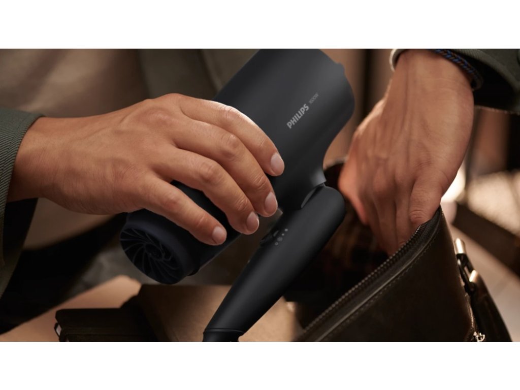 Kompaktní provedení se sklopnou rukojetí usnadňuje balení a skladování, takže si fén můžete vzít kamkoli.