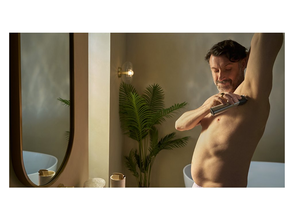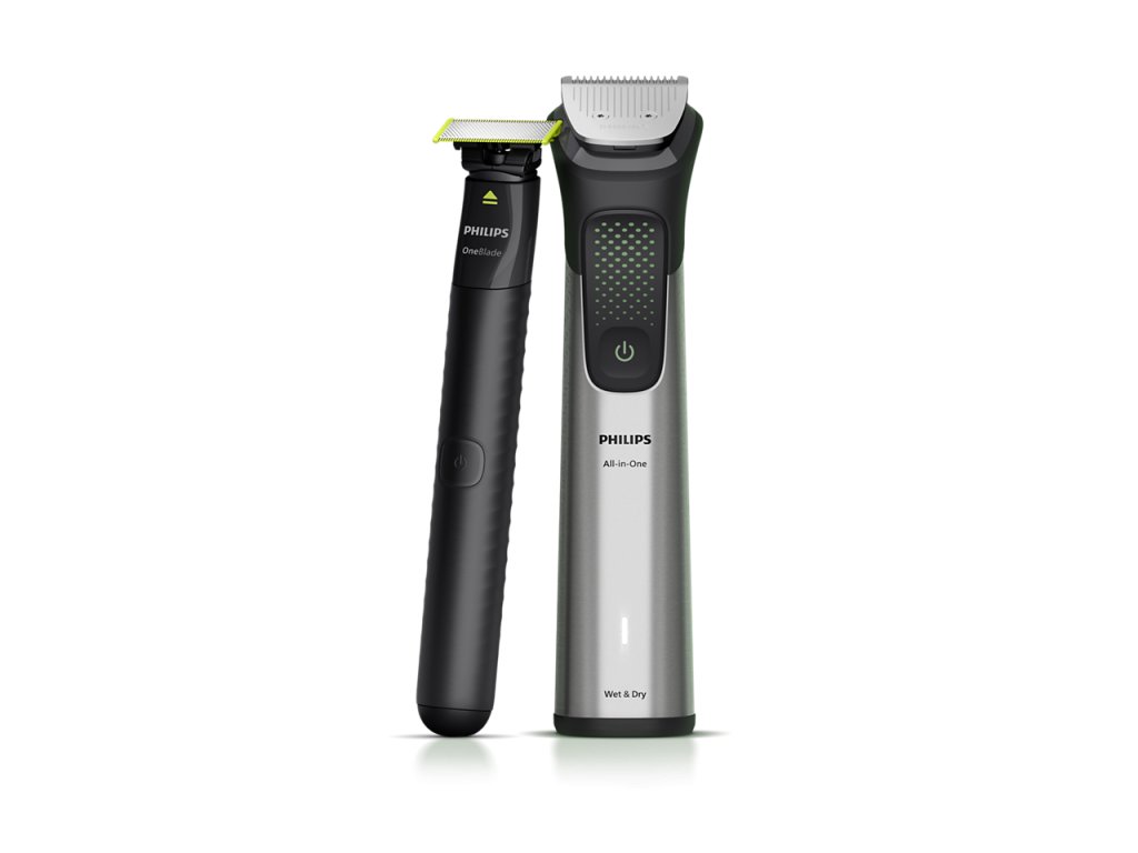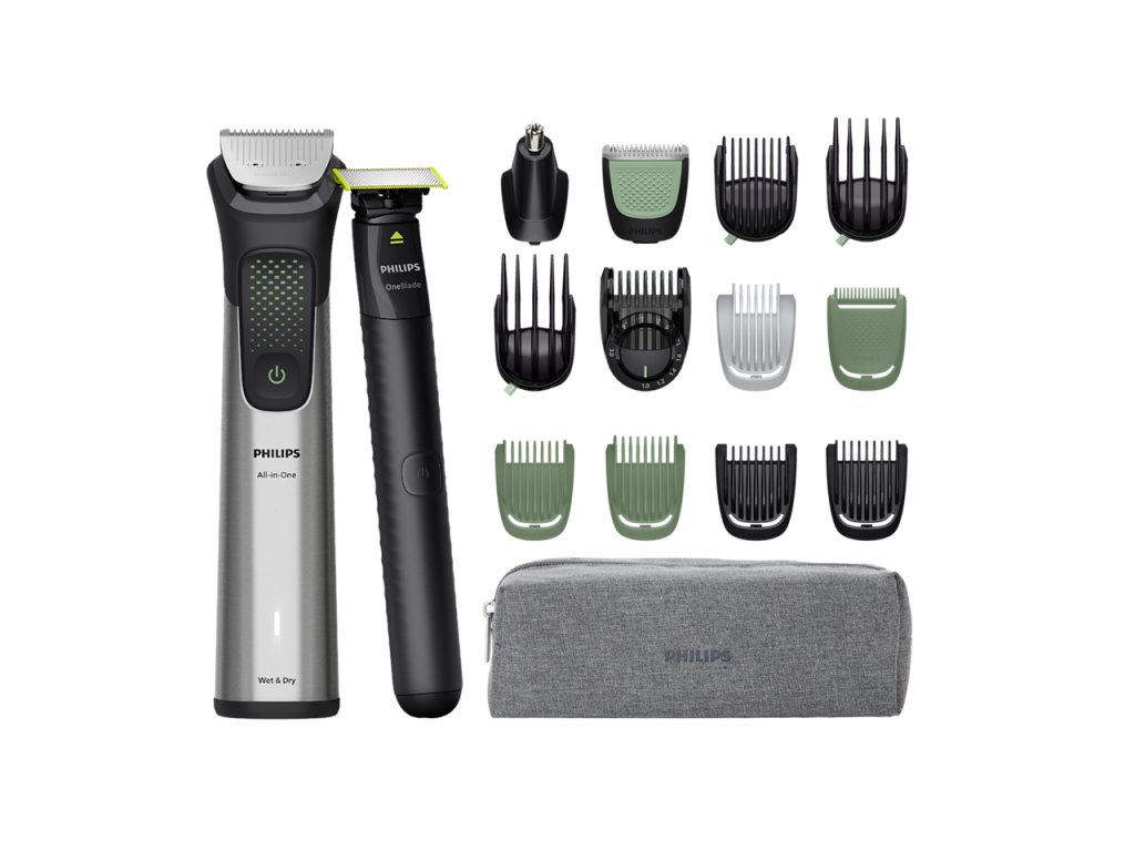 Multifunkční zastřihovač řady 9000 17v1 a OneBlade na tvář pro suché i mokré použití včetně použití ve sprše.