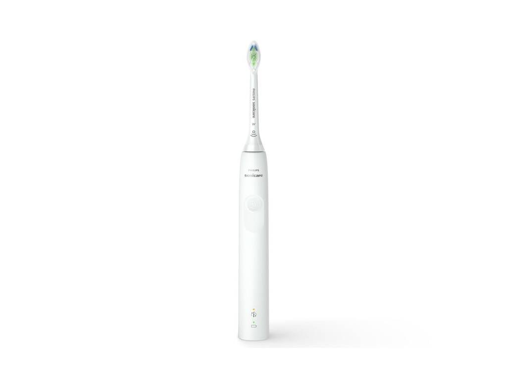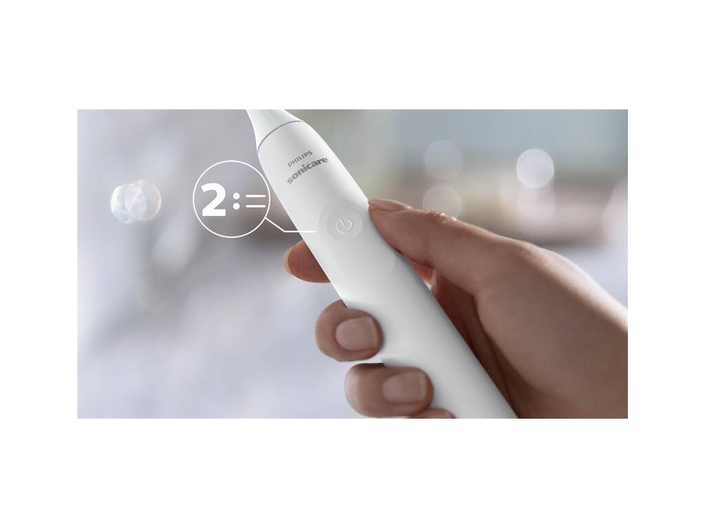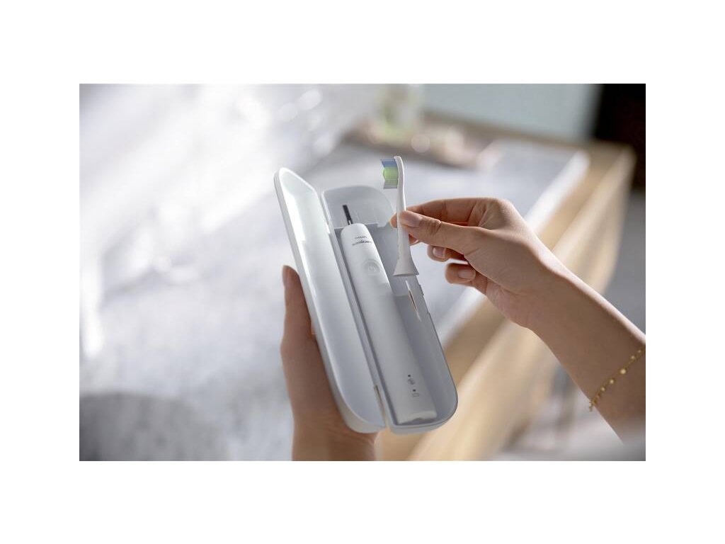 Balení obsahuje: 1 sonický kartáček Philips Sonicare 4100, 1 hlavice Philips Sonicare Optimal White, nabíjecí základna, cestovní pouzdro.