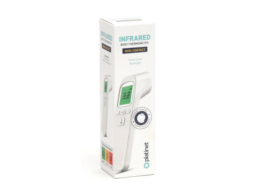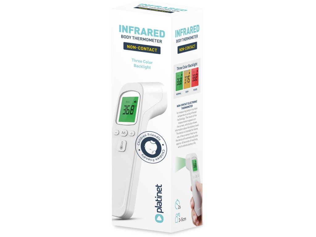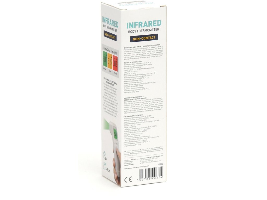 Bezkontaktní elektronický teploměr používá k měření teploty těla nebo povrchu infračervenou technologii. Výsledek měření se zobrazí na obrazovce, která také poskytuje informace o stavu baterie. Zařízení je určeno pro domácí použití, má senzor, který jej po přibližně 15 sekundách nečinnosti automaticky vypne, což prodlužuje životnost baterie.