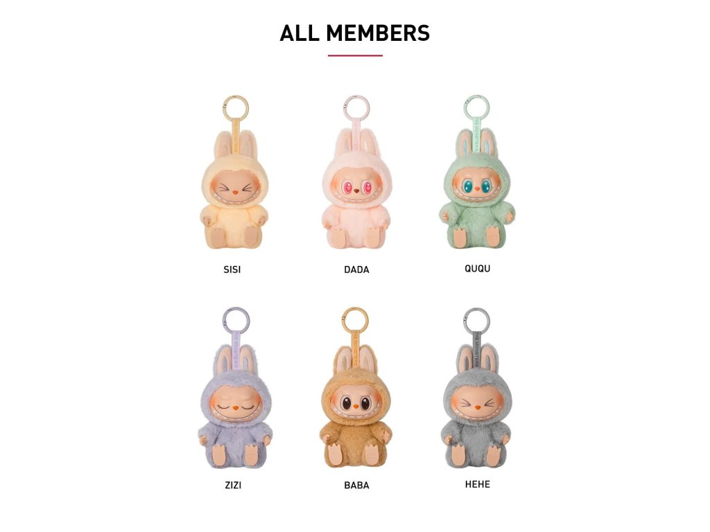 * Sisi: Labubu v jemném, krémově béžovém odstínu, který připomíná barvu sójového mléka. Její vzhled je klidný a příjemný na pohled.