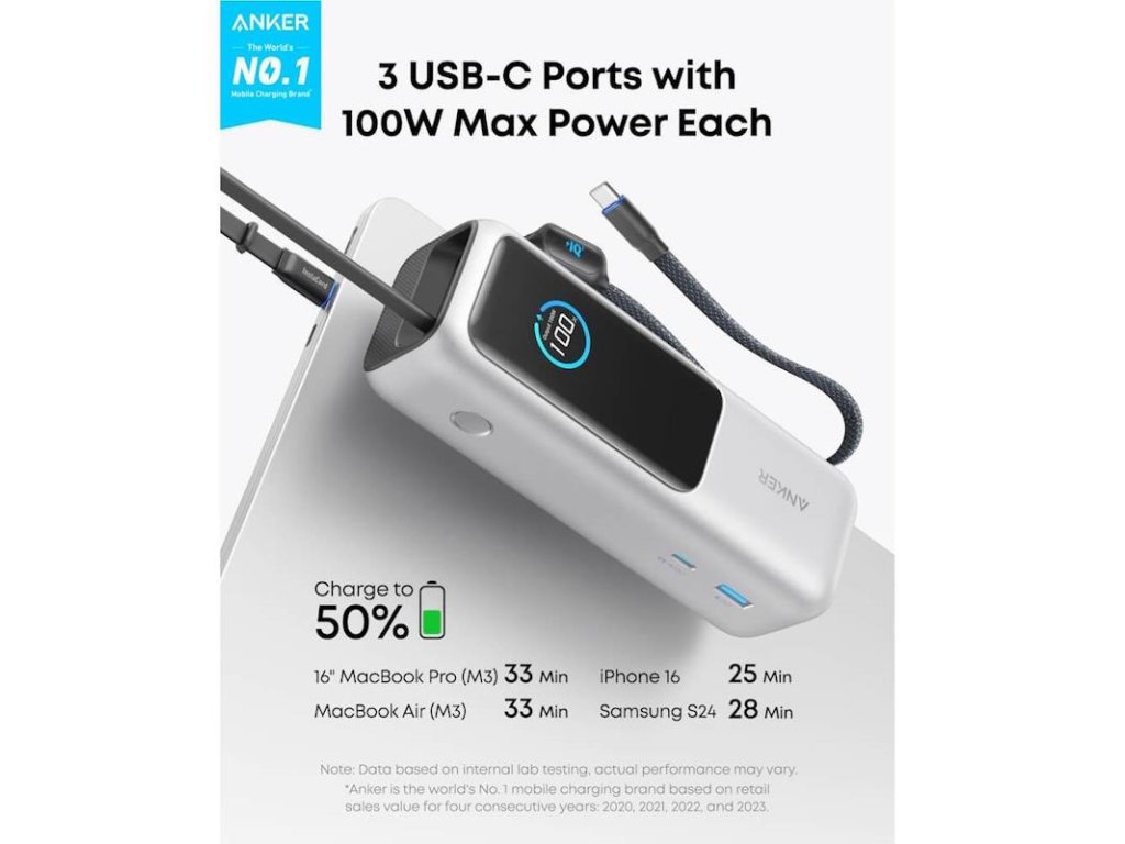 100W z libovolného portu USB-C Využijte naplno každý port USB-C, z nichž každý poskytuje 100W pro rychlé dobití powerbanky na 30 % kapacity za pouhých 20 minut.
