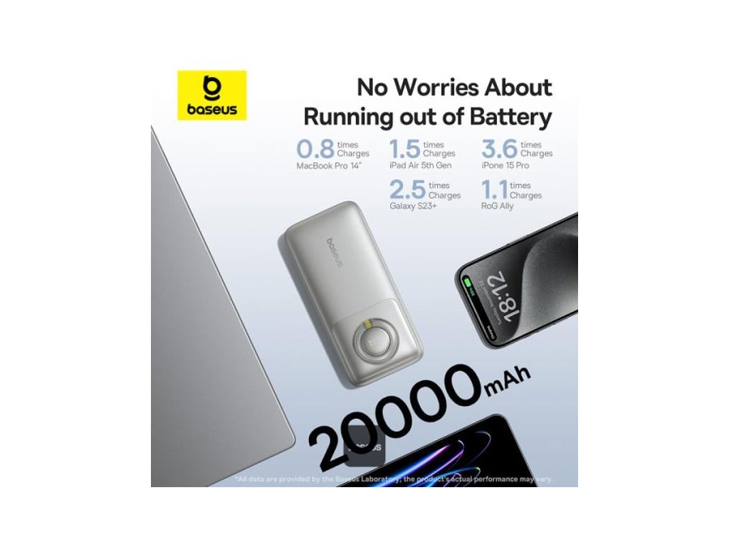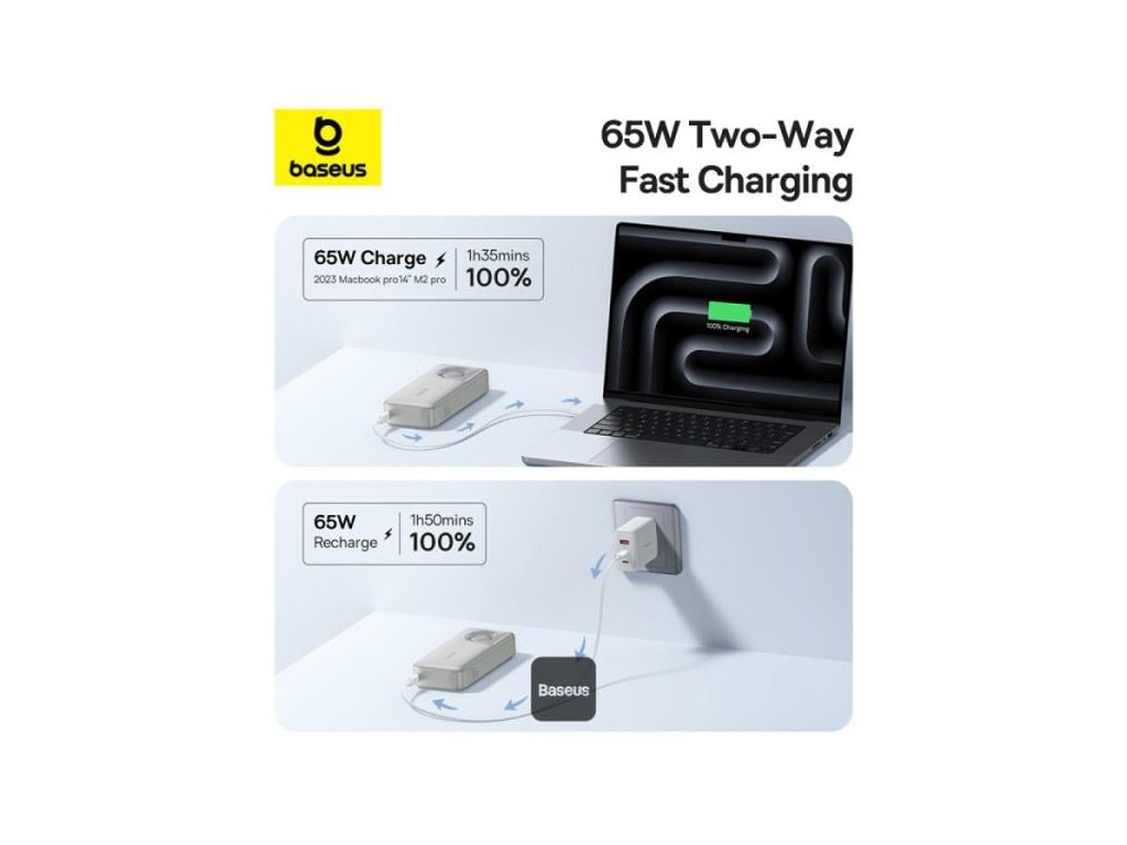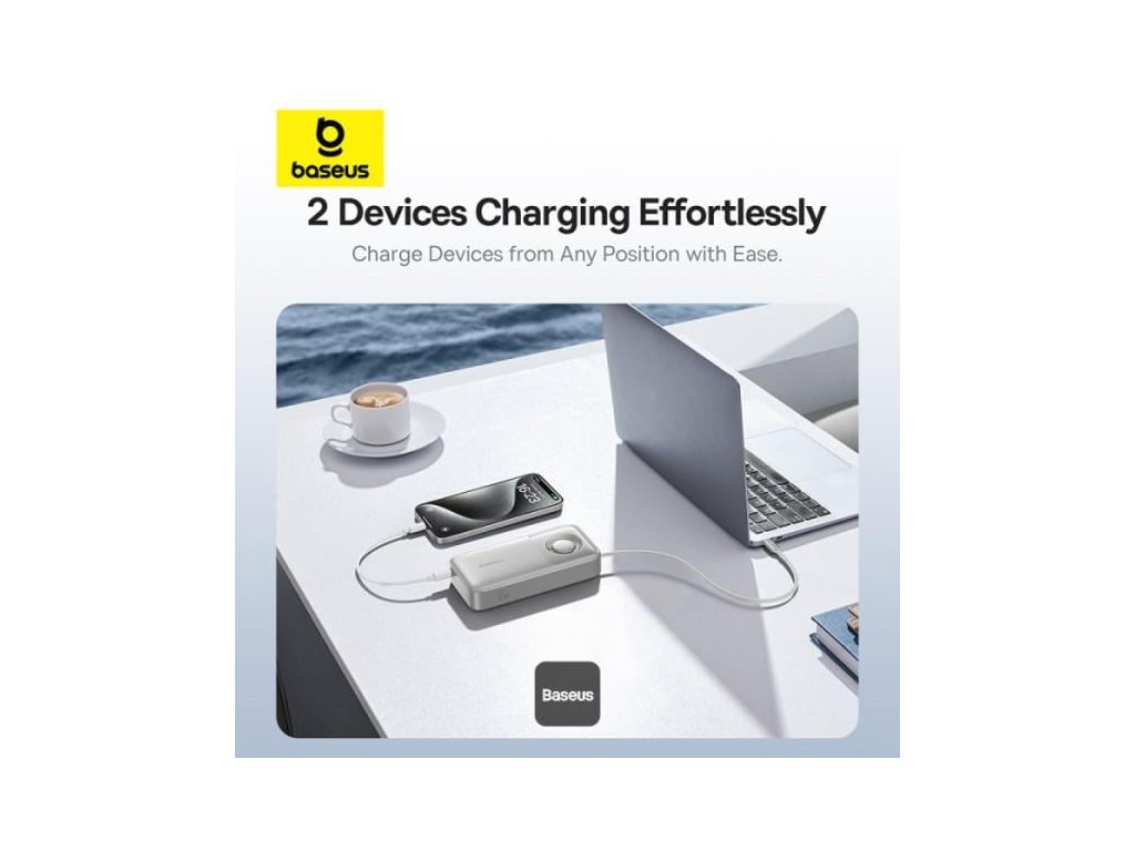 Powerbanka Baseus Free2Pull, kapacita 20000mAh, výkon 65W - rychlé nabíjení,vestavěný, zatahovací kabel USB-C, porty USB-A a USB-C, LED indikátor stavu nabití, barva bílá