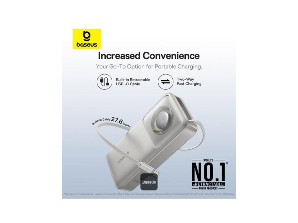 Je vybaven 2,3ft (0,7m) zatahovacím kabelem USB-C, který se bez námahy vysouvá a zasouvá, a poskytuje tak úhledné nabíjení bez zamotávání. Ideální pro snížení nepořádku v tašce nebo na pracovišti.