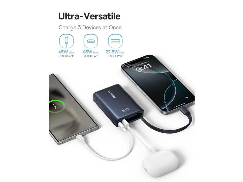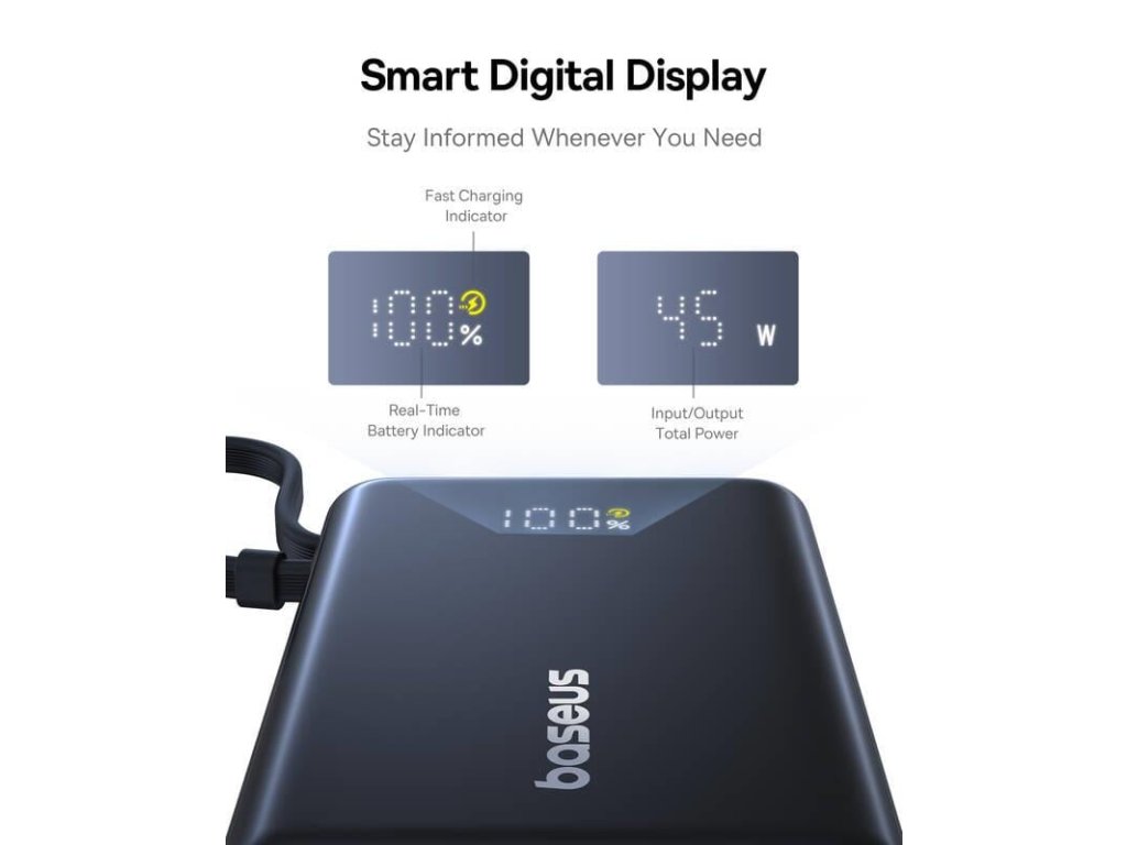 Velmi rychlé nabíjení: 45W kabel USB-C dokáže nabít iPhone 15 Pro na 57 % za 30 minutChytrý displej: Digitální displej v reálném čase zobrazuje úroveň nabití baterie a výstupní výkon pro snadné sledováníSouběžné nabíjení: Podporuje současný vstup a výstup, funguje jako powerbanka i nabíjecí staniceNabíjení více zařízení: Umožňuje nabíjení až tří zařízení pomocí dvou portů USB-C a jednoho portu USB-AVhodné na cesty Kapacita 10 000 mAh v kompaktním provedení je vhodná pro cestování letadlemVysoká kapacita v malých rozměrech