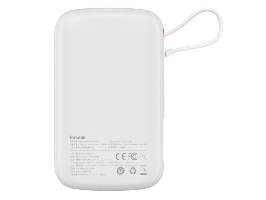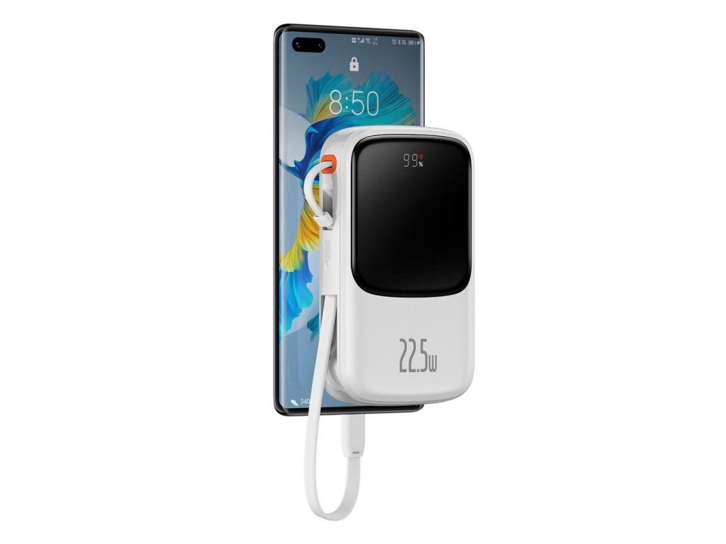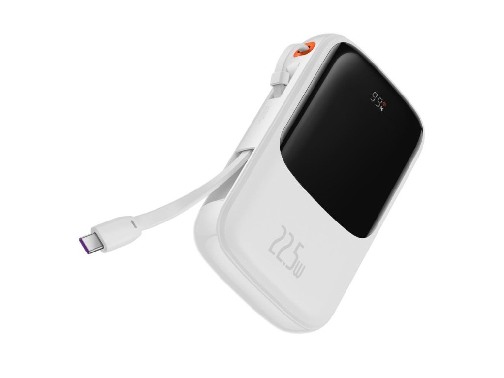 Powerbanka Baseus Qpow Pro, kapacita 10000mAh, výkon 22,5W - rychlé nabíjení, vestavěný kabel USB-C + 2 výstupní porty USB-A a USB-C, nabití powerbanky za 3 hod,displej pro zobrazení stavu baterie, váha 236g, barva bílá