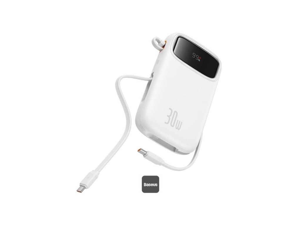 Powerbanka Baseus Qpow2, kapacita 20000 mAh, výkon 30W, 2x USB-C, 1x USB-A, 1x zabudovaný kabel USB-C, váha pouhých 360g, barva bílá