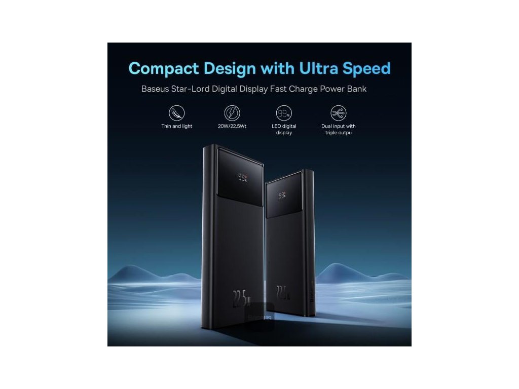 Powerbanka Baseus Star-Lord, kapacita 10000mAh,výkon 22,5W,rychlonabíjení PD 20W,porty vstup Micro USB, vstup USB-C, výstup USB-C, 2x výstup USB-A/USB-A, LED displej, barva černá