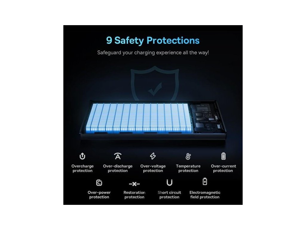 V zařízení je zabudován teplotní senzor NTC, který spolu s inteligentním čipem zajišťuje bezpečné nabíjení a chrání před přehřátím. Powerbanka zaručuje víceúrovňovou ochranu proti přebíjení, přepětí, nadproudu, zkratu a elektromagnetickému poli. Můžete tak bez obav nabíjet svá vybraná zařízení!