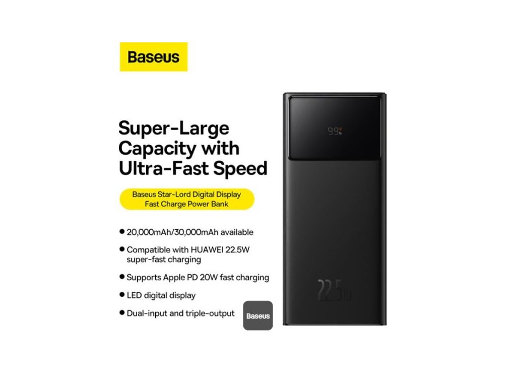 Powerbanka Baseus Star-Lord, kapacita 20000mAh,výkon 22,5W - rychlé nabíjení, porty 2x USB-A, 1x USB-C, LCD displej zobrazuje stav nabití powerbanky a také ikonu rychlého nabíjení, nabíjení powerbanky porty USB-C a Micro USB, nabíjení trvá 6-7 hod, barva