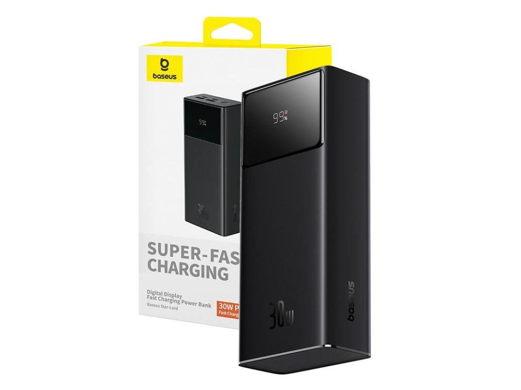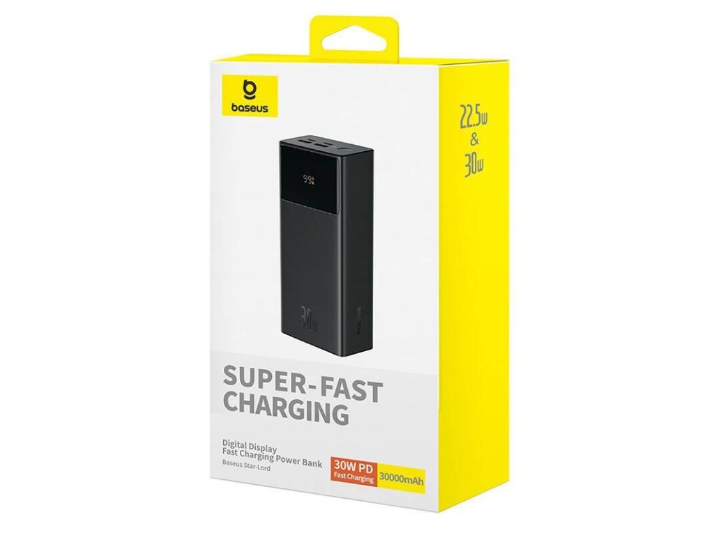 Powerbanka Baseus Star-Lord, kapacita 30000 mAh, výkon 30 W,podporuje rychlé nabíjení, hmotnost 658,8 g, LED displej ukazuje informace o stavu nabití power banky,barva černá