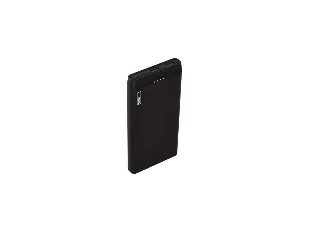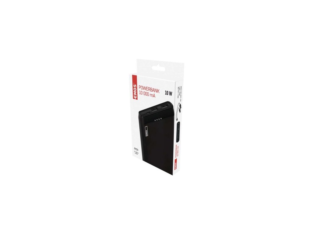 Powerbanka EMOS Alpha 10S s kapacitou 10 000 mAh, 2× USB-A výstupy, micro USB a USB-C kabely v balení. Max. výstupní proud 2 100 mA/5 V. Ochrany proti podbití, přebití, přetížení a zkratu. LED indikátory stavu baterie. Rozměry: 138×68×16 mm, hmot: 220g