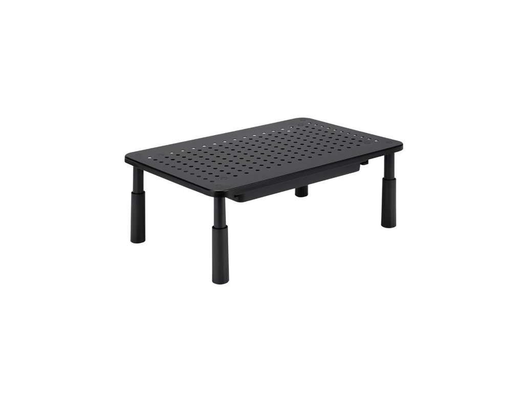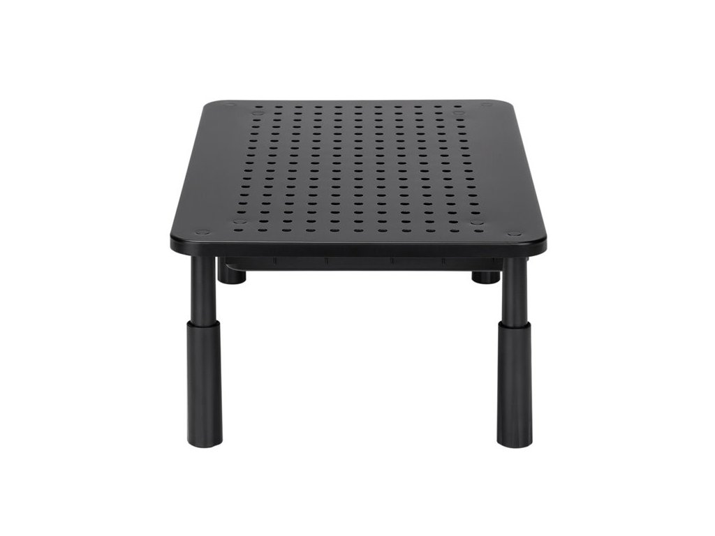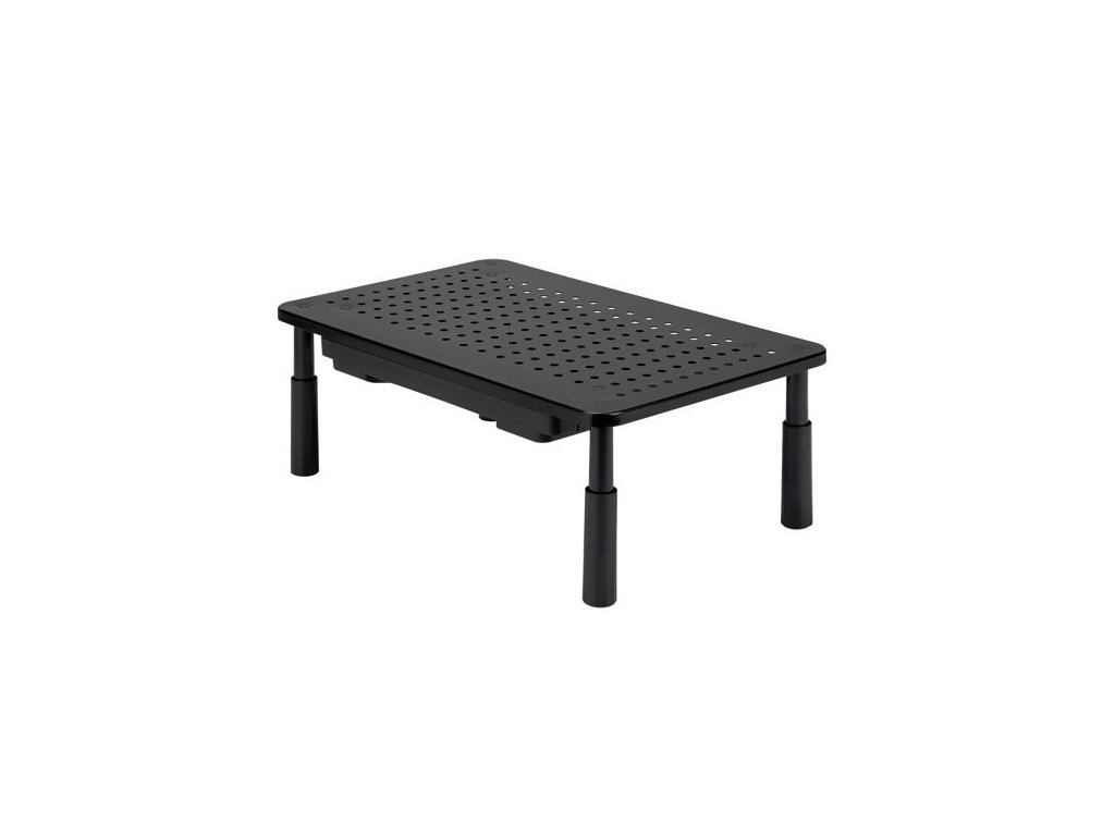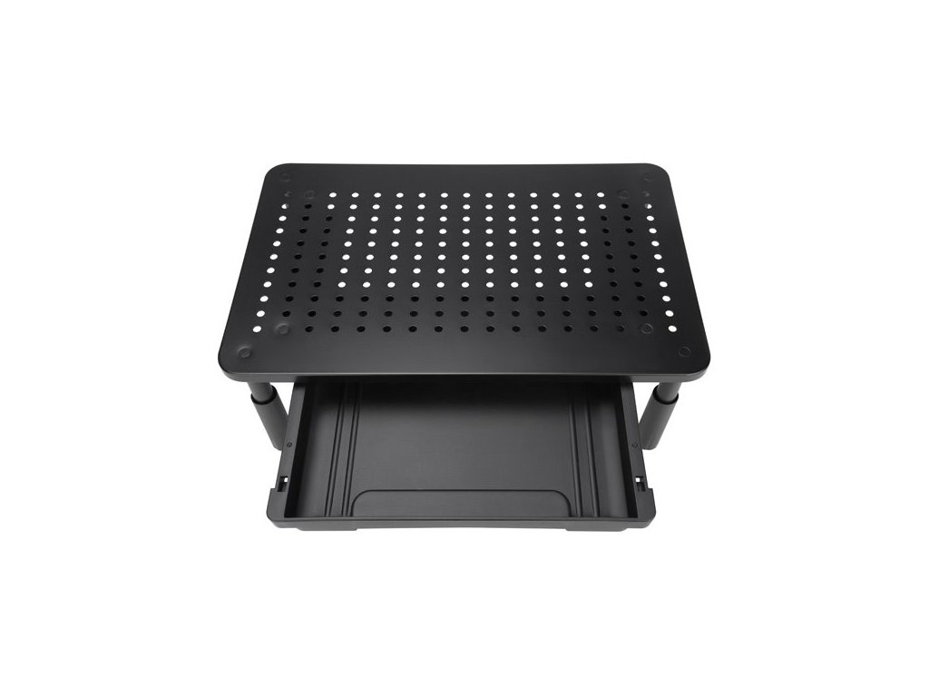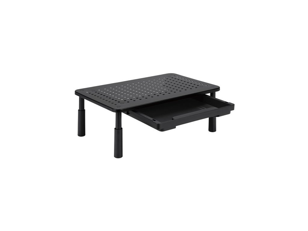 Podstavec pod monitor, nastavitelná výška, větrací otvory, se zásuvkou, černý, ocel-plast, 20 kg nosnost
