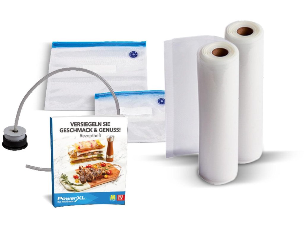 PowerXL Duo NutriSealer je přenosná vakuovačka, výkonná inovace pro udržení čerstvého a plného jídla! Všestranný ruční vakuový zatavovač 6 v 1 včetně rozsáhlého příslušenství pro vakuové těsnění, těsnění, vakuové těsnění a těsnění, opětovné utěsnění, řezá