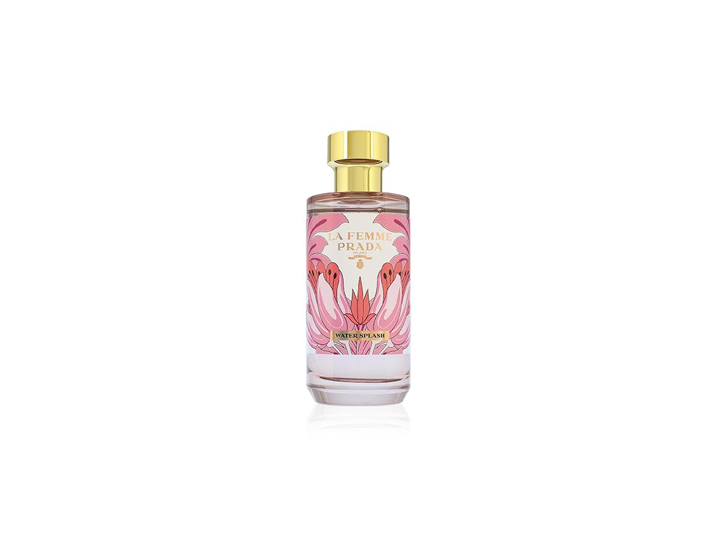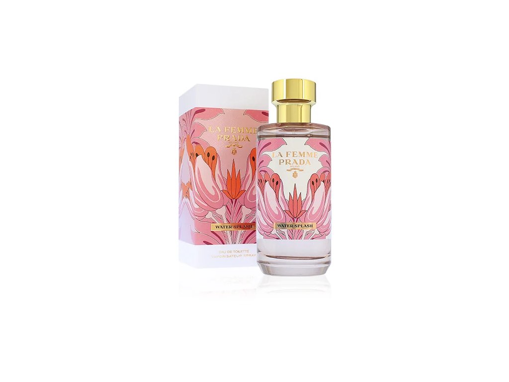 Dámská toaletní voda Prada La Femme Water Splash vás přenese do tropického ráje plného citrusů, květin a bujné zeleně. Tuto novinku pro rok 2019 představila Prada společně s pánskou verzí L'Homme Water Splash. Květinově-citrusovou exotickou vůni zvýrazňuje i vzhled flakonu s motivem bujných růžových květů.