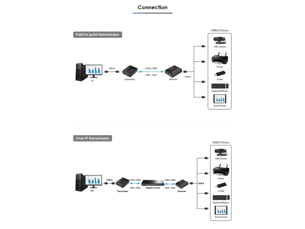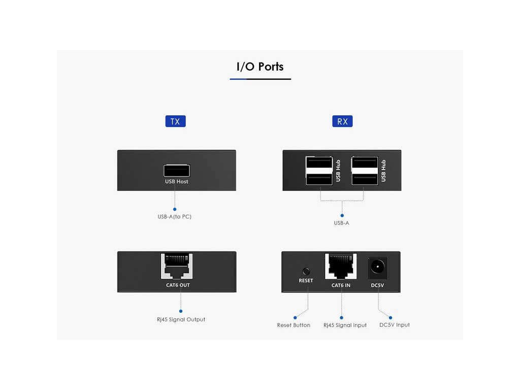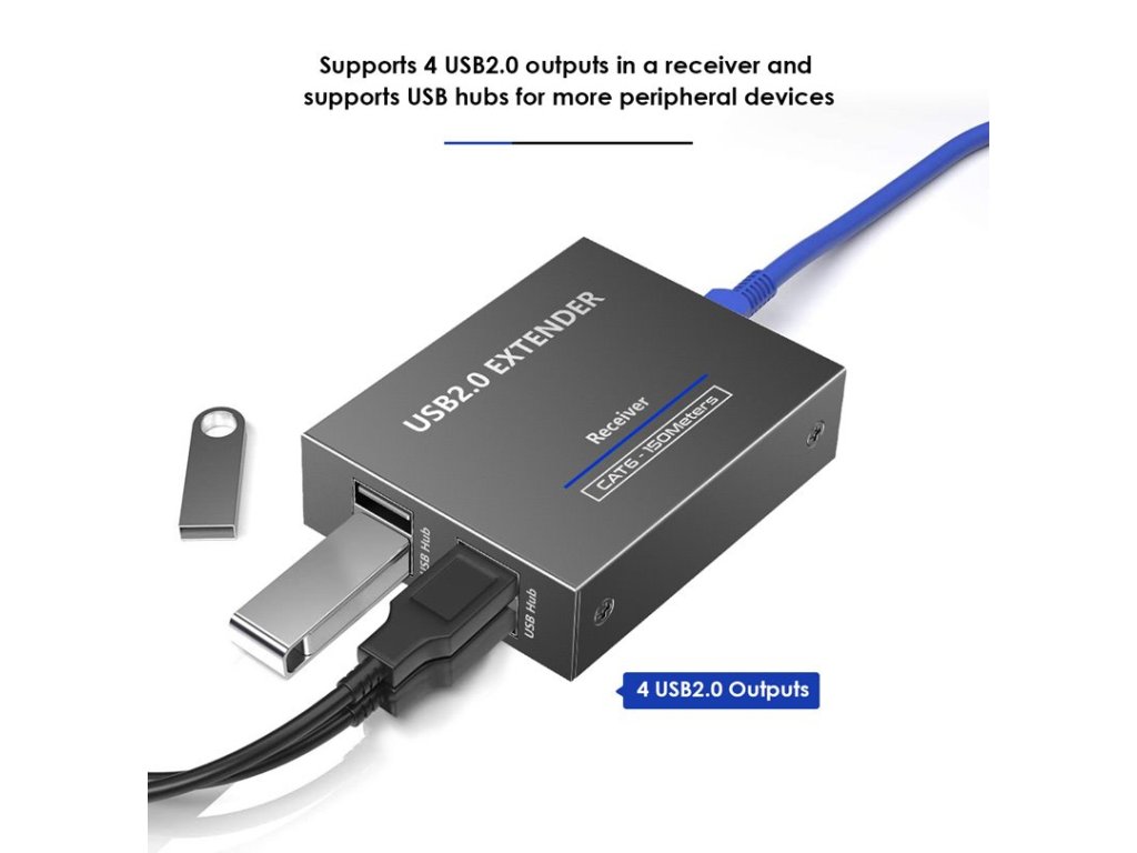 a umožňuje zapojit všechny USB periferie až do vzdálenosti až 150m. Pomocí levného kabelu Cat5/Cat5e/Cat6 se dosáhne ekonomického a efektivního řešení.