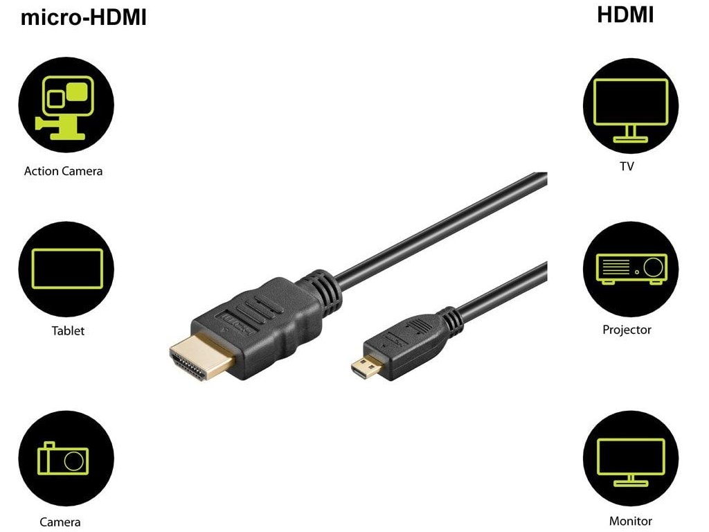 - Pozlacené konektory: HDMI typ A (19pinů) male <=> HDMI micro typ D (19pinů) male