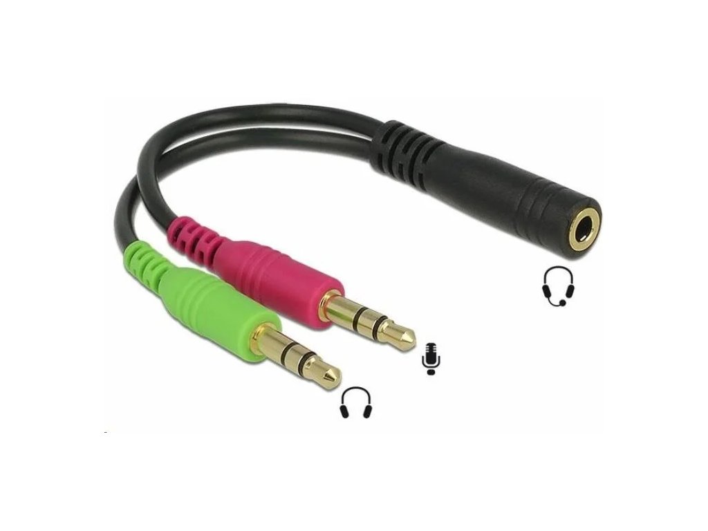 Redukce pro sluchátka s mikrofonem, který je vybaven 4-pinovým konektorem 3,5mm. Na výstupu redukce jsou dva stereo Jacky 3,5mm, které se zasunou do zvukové karty nebo do zeleného a červeného konektoru pro sluchátka a mikrofon na počítači.