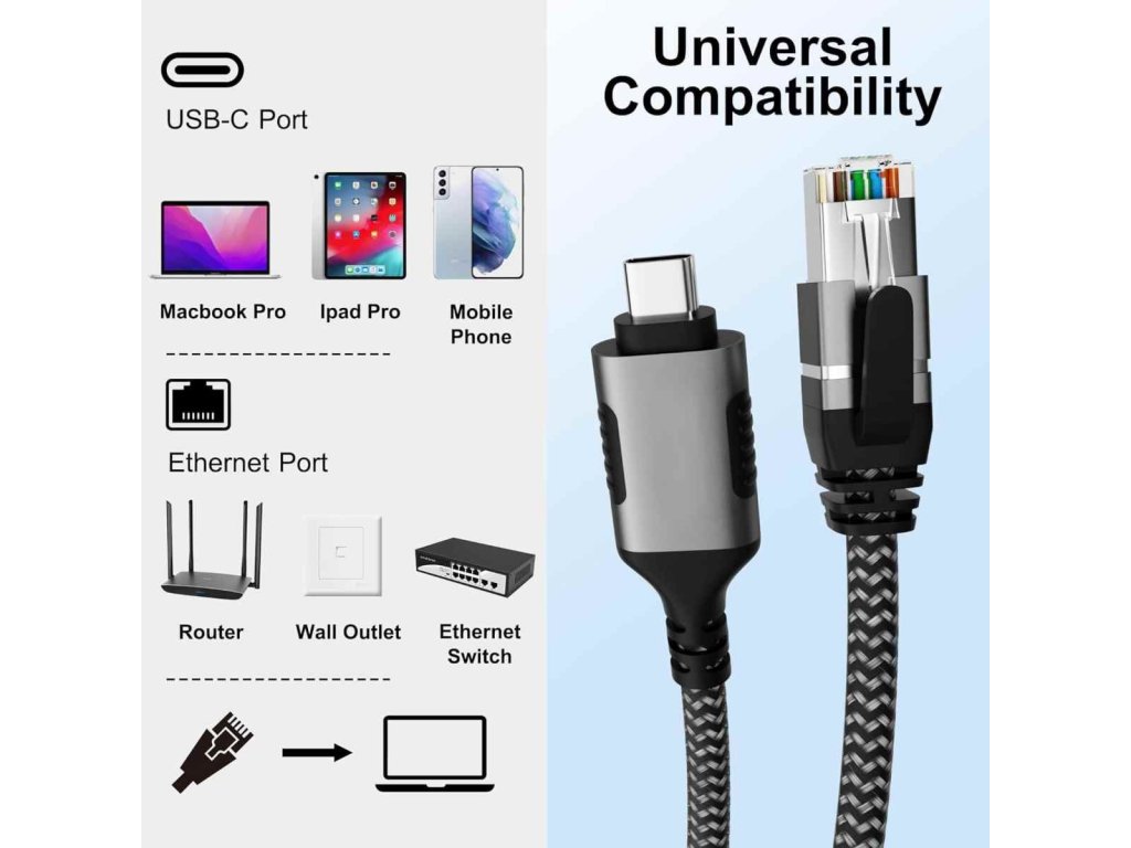 - Kabel obsahuje integrovanou síťovou kartu / Gigabit Ethernet USB adaptér.Ethernetový kabel USB-C 3.1 až RJ45, který řeší problém, kdy zařízení nemá síťový port. Kabelové připojení je stabilnější.