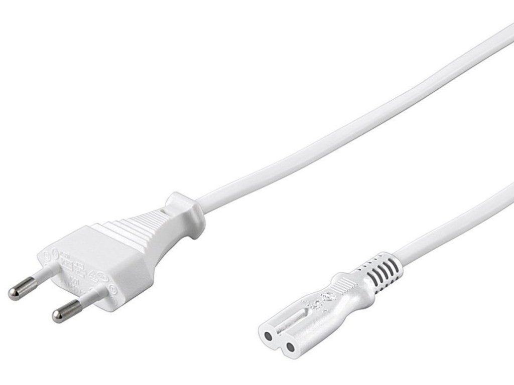 Napájecí kabel v bílém provedení pro napájecí adaptér. Dvoužilový kabel je zakončený koncem v podobě ležaté osmičky.