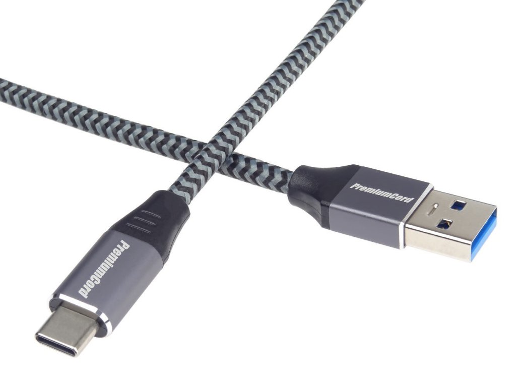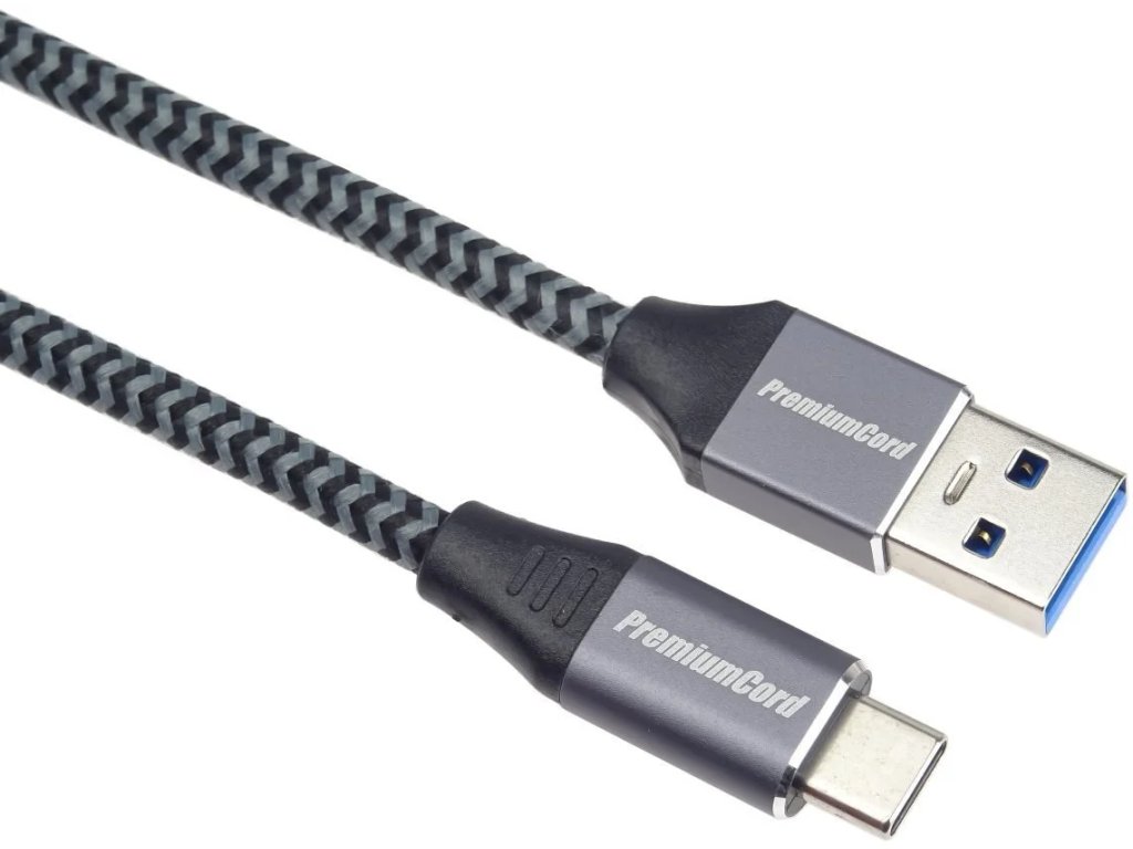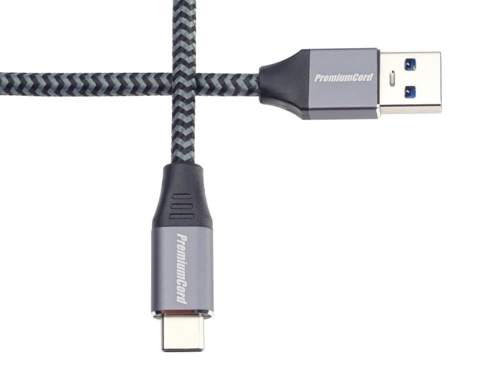 PremiumCord kabel USB-C - USB 3.0 A (USB 3.1 generation 1, 3A, 5Gbit/s) 3m bavlněný oplet a kovové hliníkové konektory