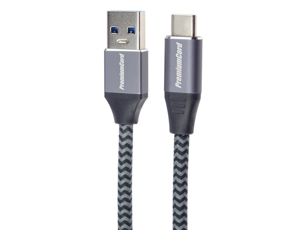 PremiumCord kabel USB-C - USB 3.0 A (USB 3.2 generation 1, 3A, 5Gbit/s) 3m bavlněný oplet a kovové hliníkové konektory