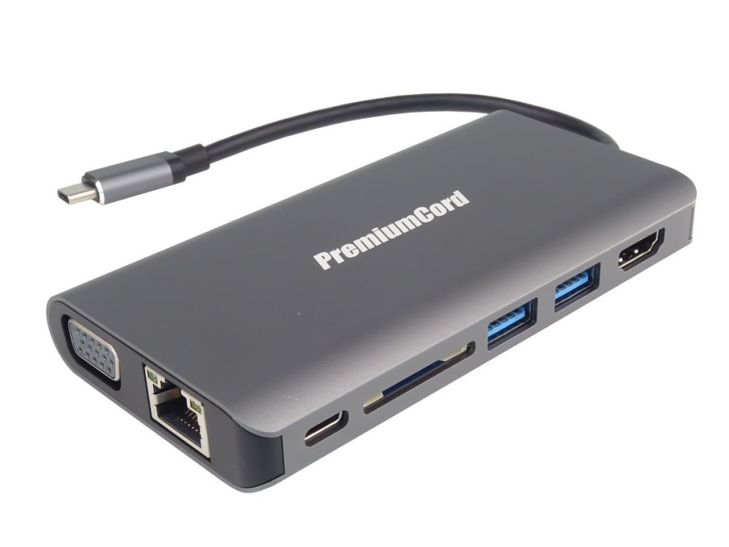 PremiumCord Převodník USB-C na HDMI + VGA + RJ45 + 2xUSB3.0 + SD card + 3,5mm + PD charge, hliníkové pouzdro