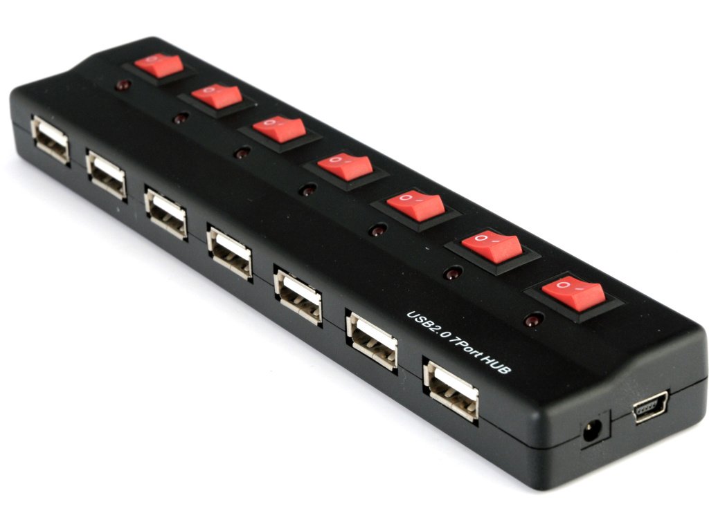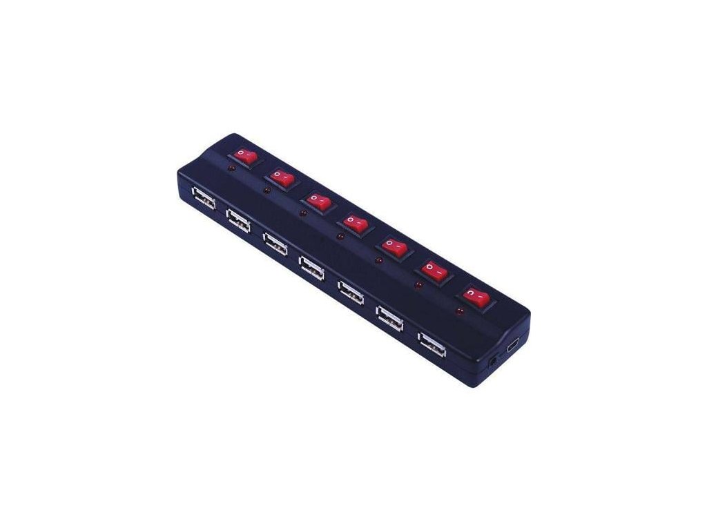 USB hub externí, aktivní (externí napájecí adaptér 230V), USB 2.0, 7 portů, možnost pomocí vypínače vypnout jednotlivé porty hubu, podle potřeby