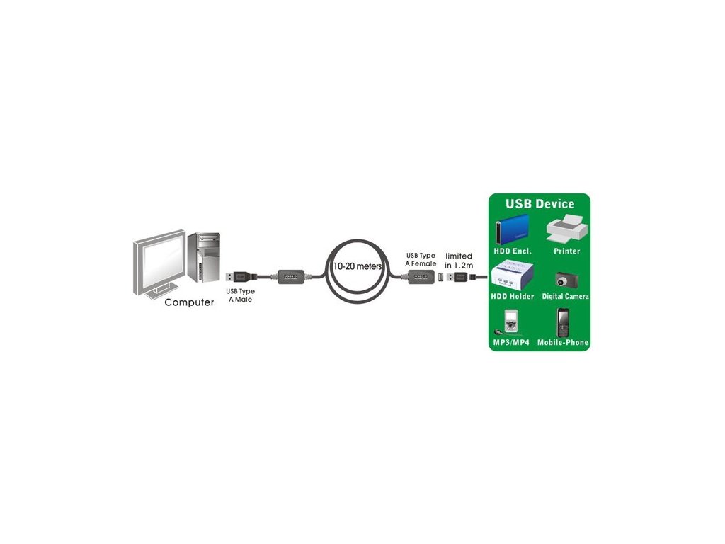 Kabel má aktivní zesilovač a je vhodný pro prodloužení USB3.0 a USB2.0 kabelu o dalších 10m . Standardní USB pasivní kabel je omezen délkou maximálně 5m. Pomocí tohoto aktivního kabelu je možné prodloužit délku o 10m.