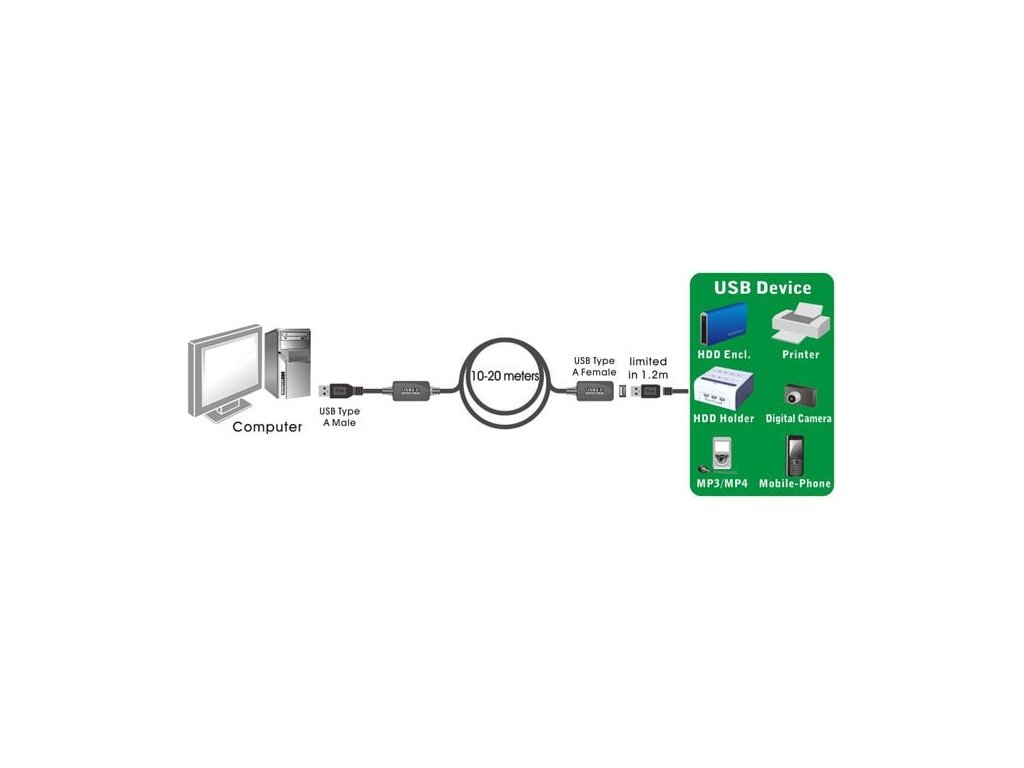 Kabel má aktivní zesilovač a je vhodný pro prodloužení USB3.0 a USB2.0 kabelu o dalších 15m . Standardní USB pasivní kabel je omezen délkou maximálně 5m. Pomocí tohoto aktivního kabelu je možné prodloužit délku o 15m.