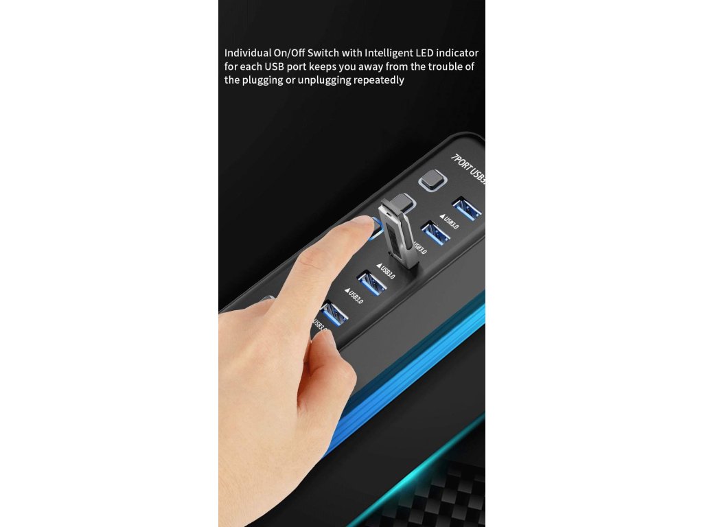 - USB hub nemá vlastní zdroj, je napájen z připojeného počítače prostřednictvím USB3.0 portu