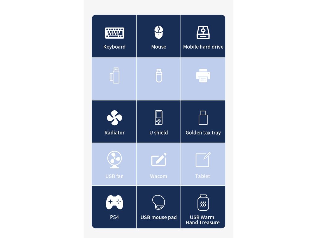 - Vhodné pro zašízení jako USB flash disky, klávesnice, myši, přenosné pevné disky, čtečky karet, tiskárny, USB periferie jako větráky, jako zdroj pro nabíjení z USB