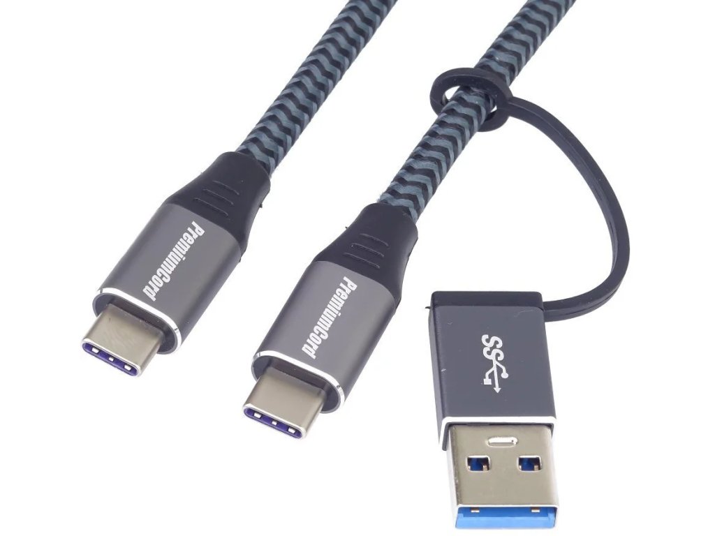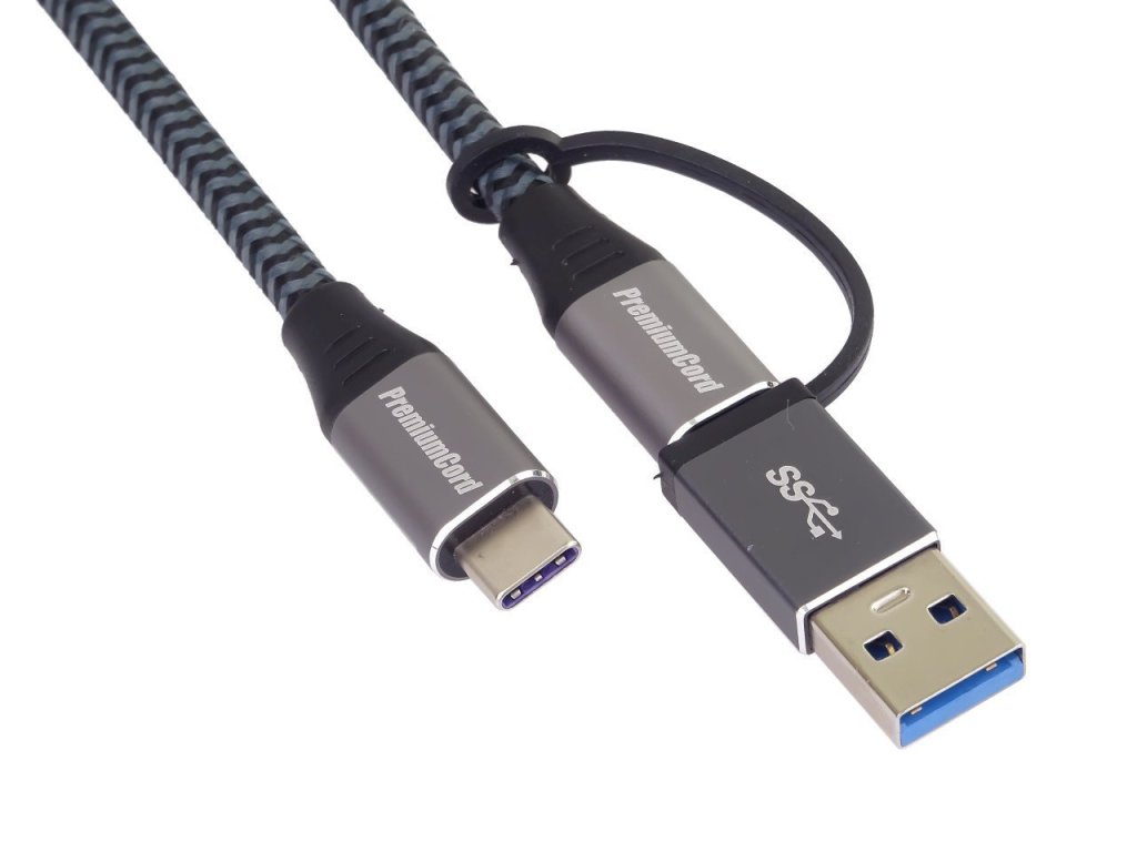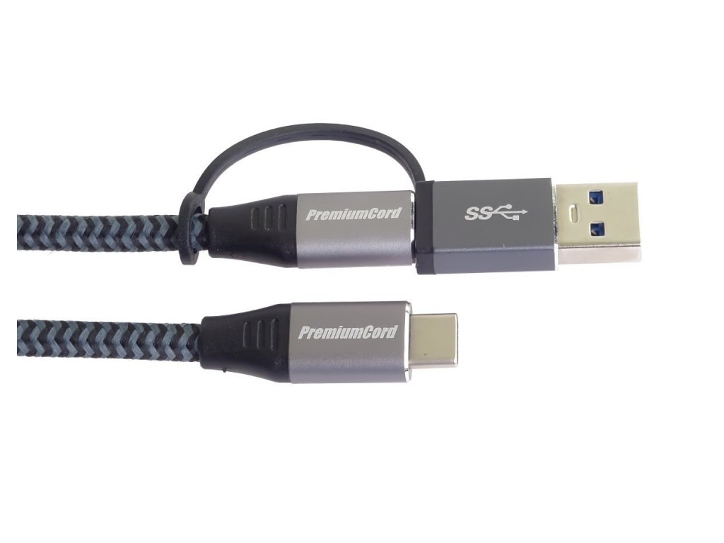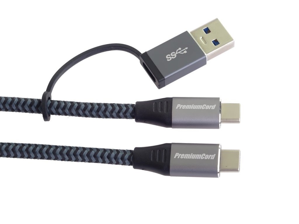 PremiumCord USB-C kabel ( USB 3.2 GEN 2x2, 5A, 100W, 20Gbit/s ) hliníkové krytky konektorů, bavlněný oplet + redukce USB-C/USB A 2m