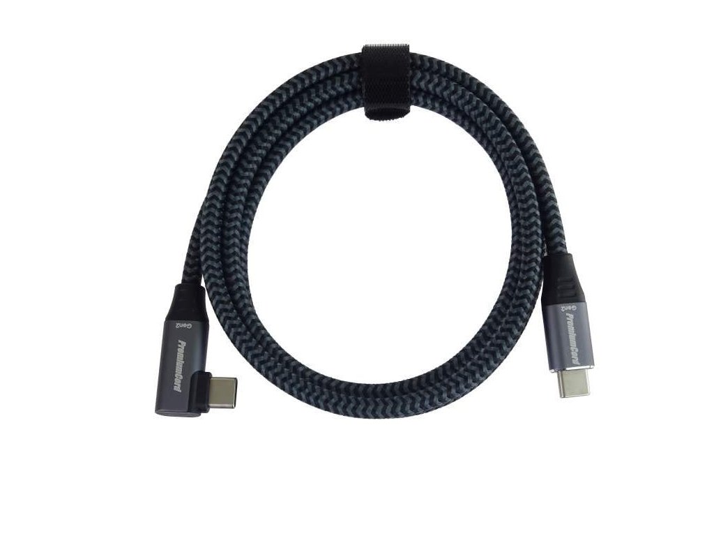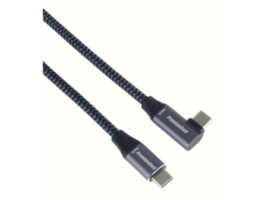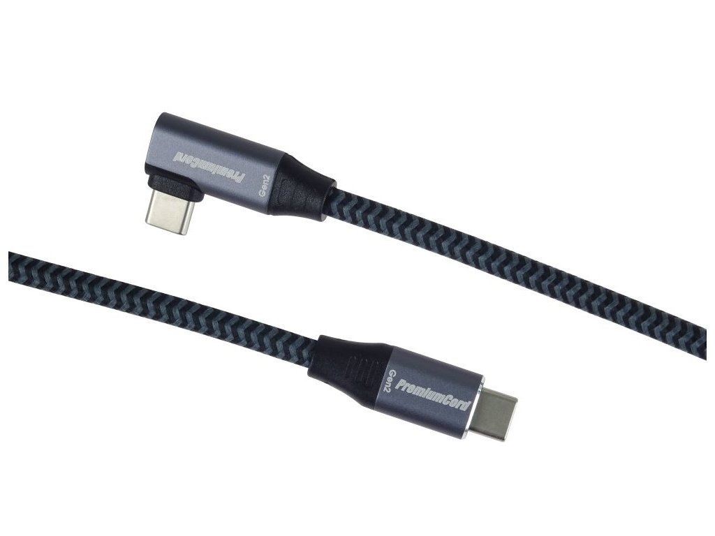 PremiumCord USB-C zahnutý 90° kabel ( USB 3.2 GEN 2x2, 5A, 100W, 20Gbit/s ) hliníkové krytky konektorů, bavlněný oplet, 1m