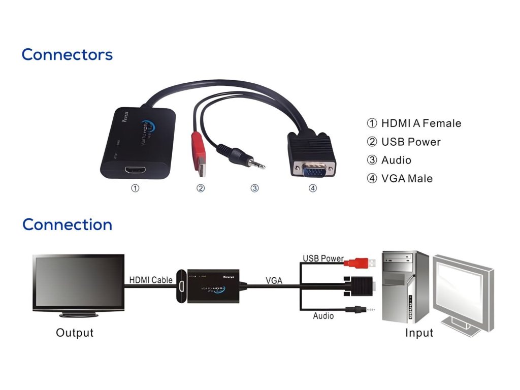 - Převádí signál VGA na digitální rozhraní HDMI pro LCD nebo TV