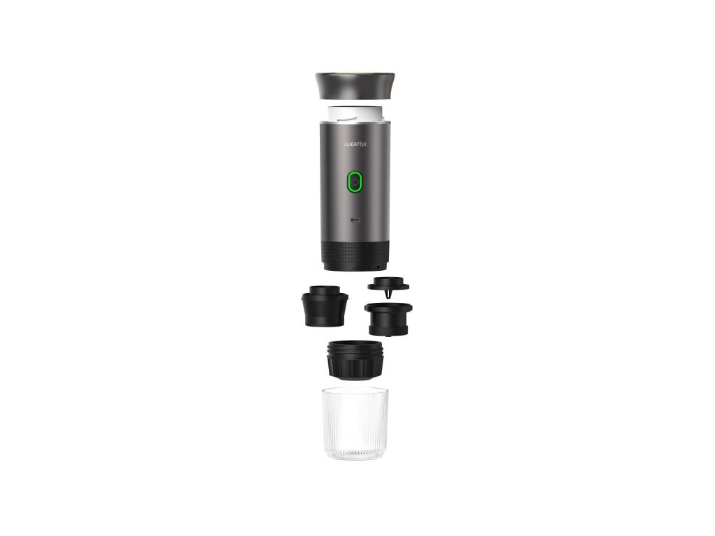 Aligator PortaCaffé zaujme už na první pohled svým elegantním a minimalistickým designem. Matné barvy s kovovým efektem v kombinaci s jemnými detaily působí luxusně a zároveň funkčně. Díky svým rozměrům a nízké hmotnosti se pohodlně vejde do batohu, auta i příruční tašky. Intuitivní ovládání jediným tlačítkem a přehledná LED signalizace z něj dělají ideálního společníka pro každodenní použití.