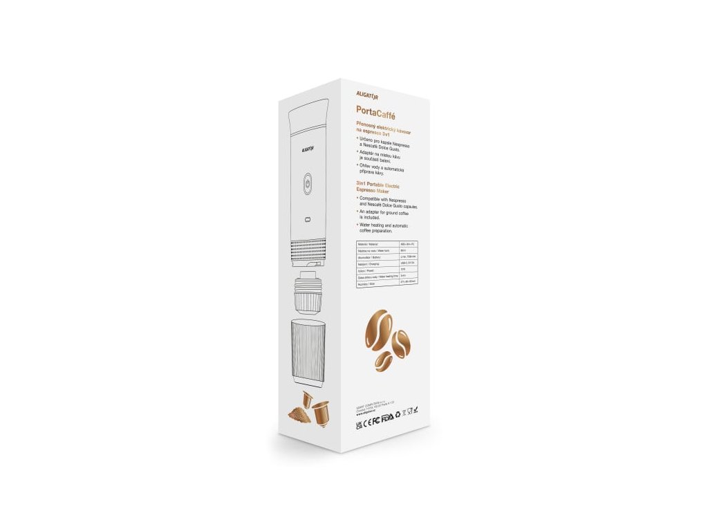 Součástí balení Aligator PortaCaffé jsou hned tři praktické adaptéry, díky kterým si můžete připravit kávu přesně podle své chuti. Adaptér pro Nespresso kapsle zajistí rychlou přípravu kvalitního espressa, a bez dalšího nepořádku. Adaptér pro Dolce Gusto kapsle umožňuje širší výběr nápojů – od espressa až cappuccino. Třetím řešením je adaptér po mletou kávu, který ocení každý milovník čerstvě namleté směsi. Výměna adaptérů je velmi snadná a intuitivní, takže přechod mezi různými typy kávy trvá jen pár vteřin.