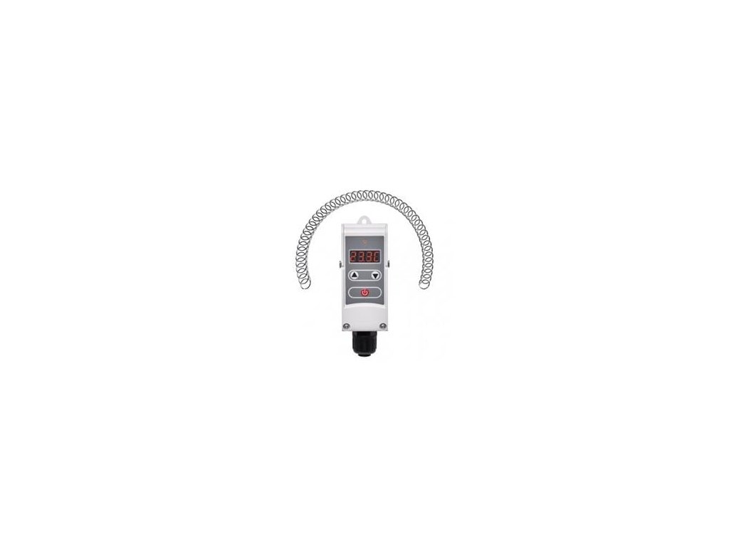 Drátový příložný termostat pro povrchovou montáž. Měří teplotu vody v zásobnících a topných systémech, umožňuje regulaci teploty a hlídání omezení. Digitální podsvícený displej, bezšroubový terminál. Měřený rozsah 5–80 °C, nastavení po 0,1 °C