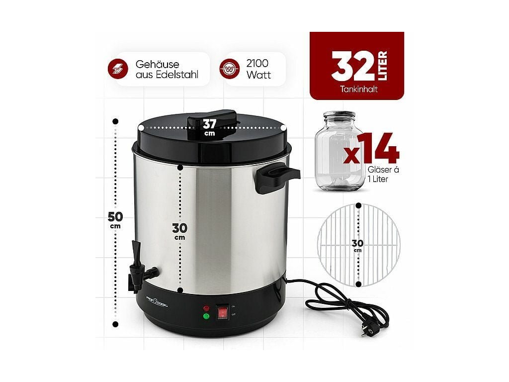 Hrnec má objem 32 litrů (pojme přibližně 14 sklenic o objemu 1 litr), vnitřní rozměry činí 30 cm na výšku a 37 cm v průměru. Výkonné nerezové topné těleso o příkonu 2100 W je skryté pro snadné čištění, zatímco plynulá regulace teploty v rozsahu 30–100 °C umožňuje přesné nastavení podle potřeby.