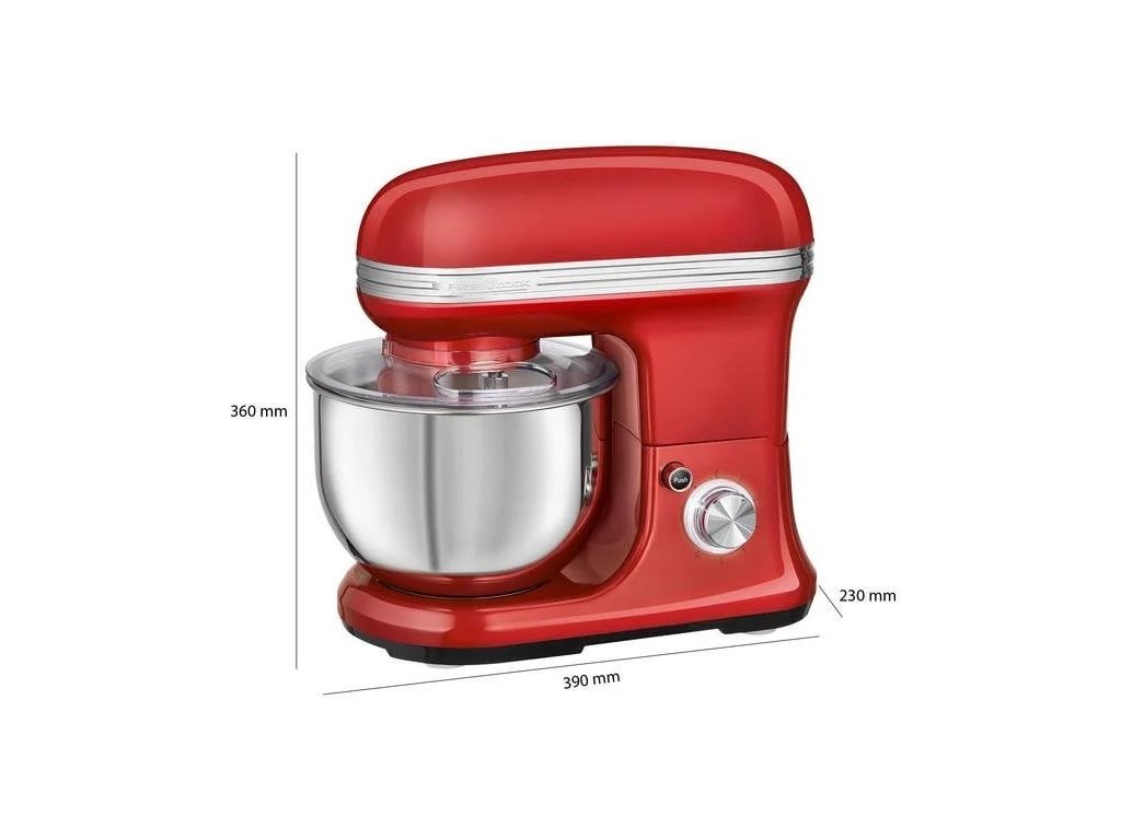 kuchyňský robot • příkon 1 200 W • 7 rychlostí • funkce hnětení, šlehání, mísení • objem nádoby 5 l • pulzní spínač • multifunkční rameno • bezpečnostní tlačítko • 2× hák na těžké a lehké těsto • šlehací metla • průhledný kryt • 38,4 × 41,3 × 24,4 cm