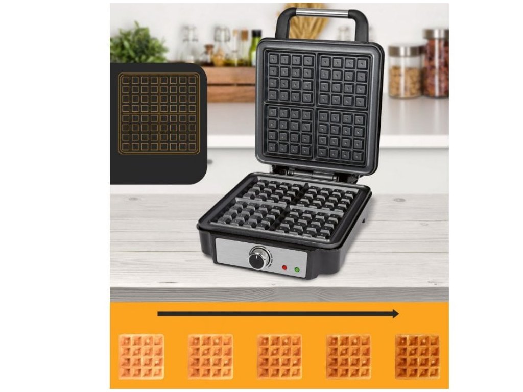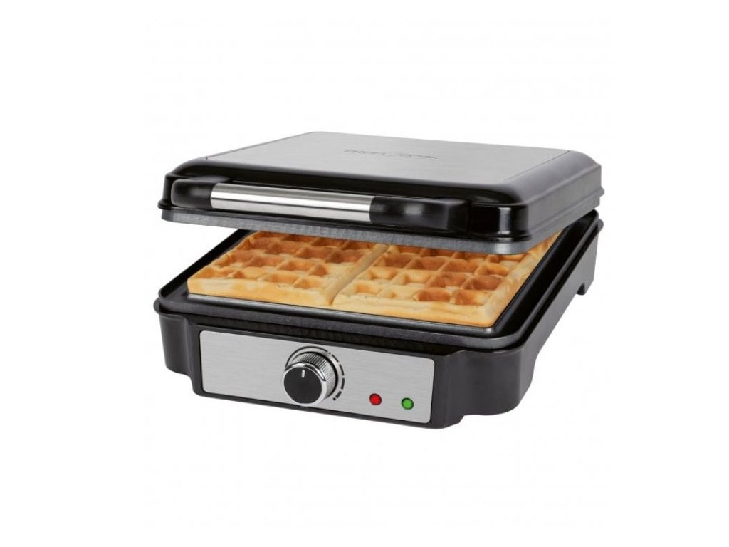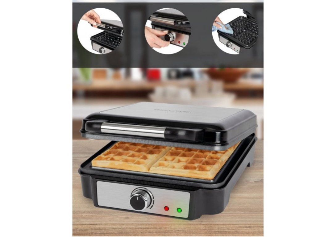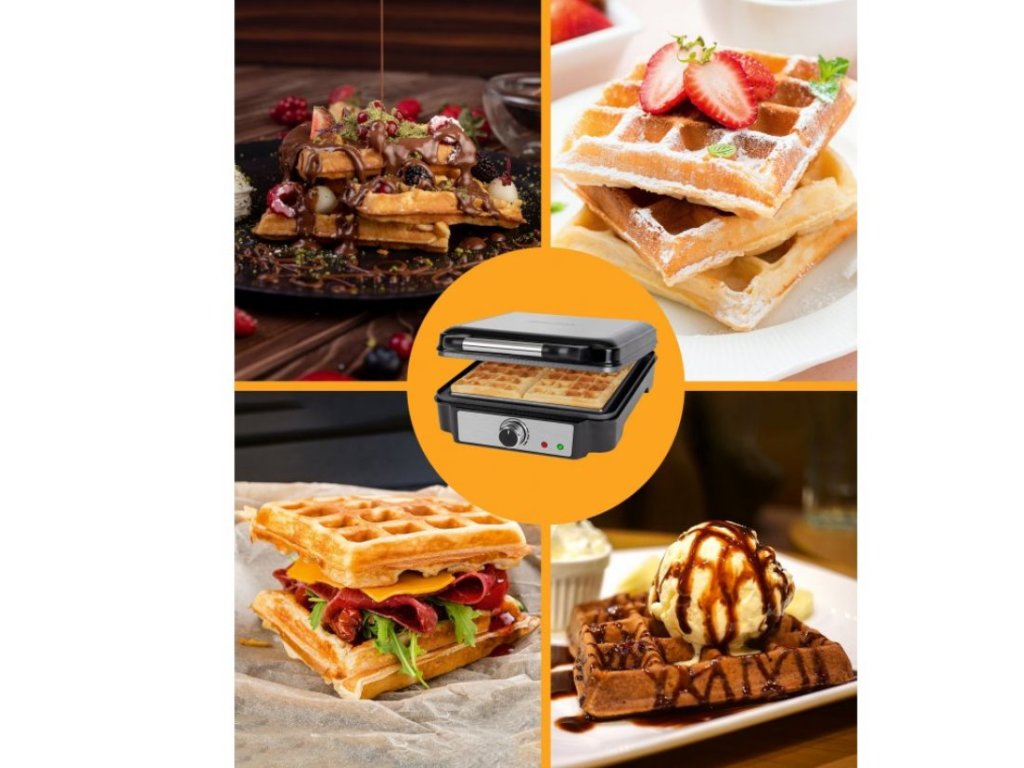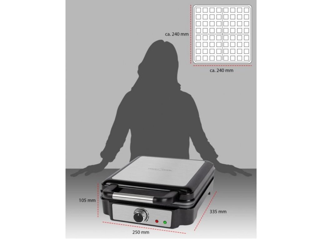 Vaflovač na pravé tradiční Bruselské vafle. 2 velké pečicí plochy, každá cca. 24,0 x 24,0 cm (nepřilnavý povrch). 4 čtvercové vafle pro každý proces pečení. 3 nerezové části: víko, rukojeť a přední část. Příprava za pár minut. Tepelně izolovaná rukojeť. Plynule nastavitelná úroveň zhnědnutí. 2 kontrolky, napájení a topení. Extra snadné čištění: Pečicí plochy s nepřilnavým povrchem – Uzavřený ochranný kanál proti přetečení který zachytí přebytečné těsto.