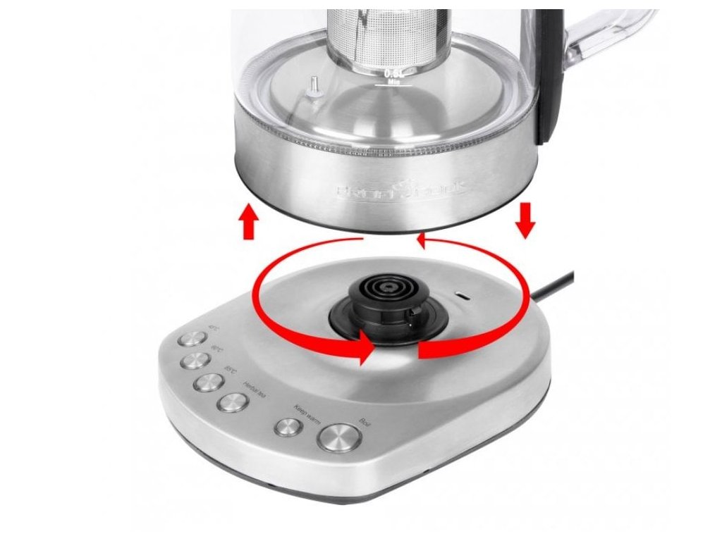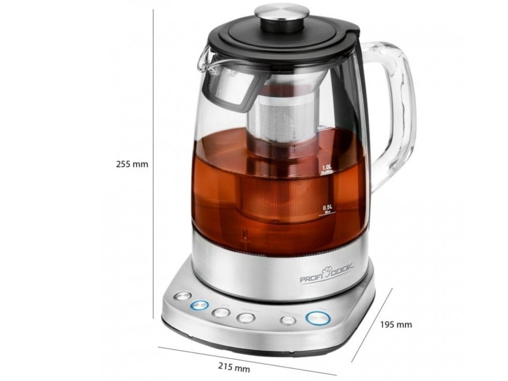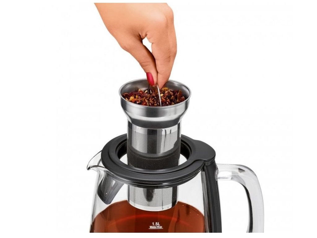 rychlovarná konvice • s regulací teploty • objem 1,5 l • příkon 2200 W • filtr a sítko na čaj • automatické vypnutí • kontrolka provozu • udržení teploty • ukazatel vodní hladiny • vyjímatelný filtr • materiál sklo